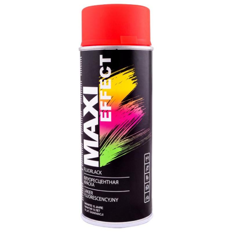 Ātri žūstoša fluorescējoša nitrocelulozes aerosolkrāsa apstrādātām un neapstrādātām metāla, betona, akmens, koka, stikla un dažāda veida plastmasas virsmām. Augstas kvalitātes rezultāts (fluorescējošais efekts) ir iespējams tikai, ja krāsa tiek uzklāta uz balta MaxiColor gruntējuma un pārklāta ar MaxiColor laku. Krāsa sarkana, tilpums 400 ml.