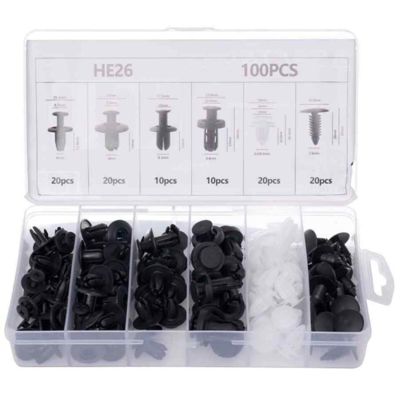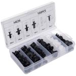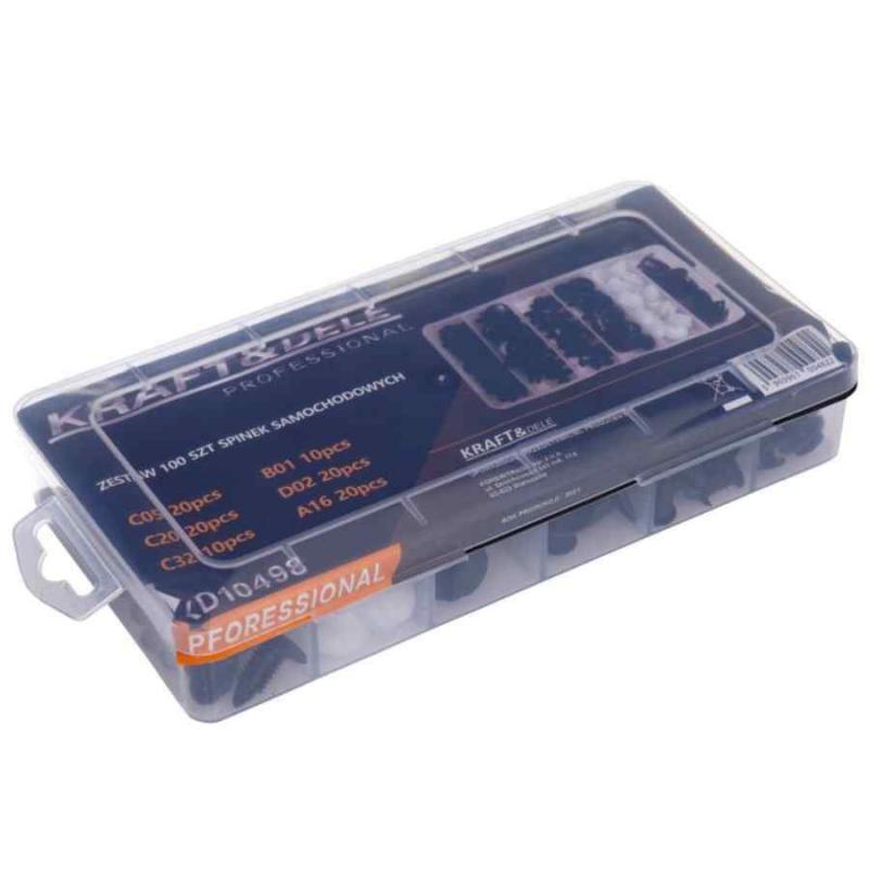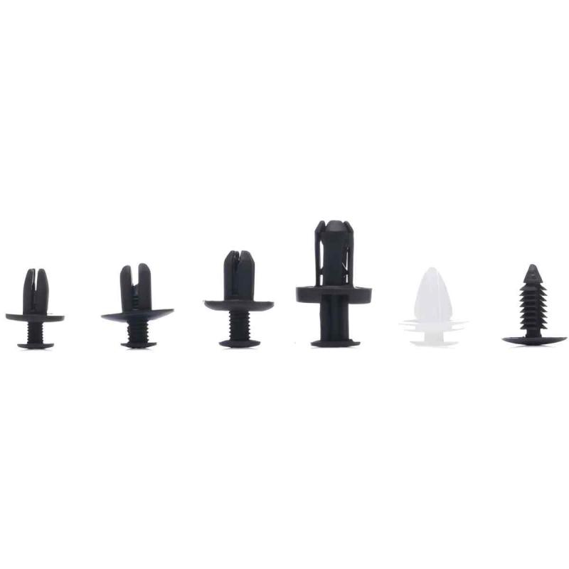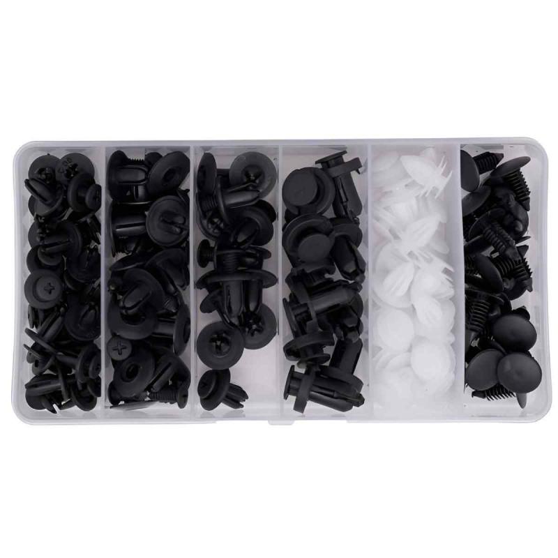 Komplekts sastāv no populārākajiem auto stiprinājumiem, kas piemēroti tādiem zīmoliem kā BMW, AUDI, LEXUS, MERCEDES, OPEL, SKODA, TOYOTA, RENAULT, CITROEN u.c. Pielietojums -bamperi, riteņu arkas, pārklājumi, polsterējums (bagāžnieks), atzveltnes krēsli un sēdekļi/polsterējumi, durvju paneļu/sānu paneļu stiprinājumi, zoda siksnas klipši.