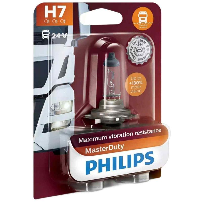 Philips MasterDuty halogēna spuldze ir paredzēta komerctransportam, kas darbojas ar 24 V sistēmu. Tā nodrošina triecienizturību un ilgāku kalpošanas laiku, padarot to ideāli piemērotu smagajiem transportlīdzekļiem, piemēram, kravas automašīnām vai autobusiem. PX26d ligzda nodrošina vieglu uzstādīšanu, savukārt MasterDuty sērija ir pazīstama ar augstu veiktspēju arī intensīvas lietošanas apstākļos. Spriegums 24 V, jauda 70 W.