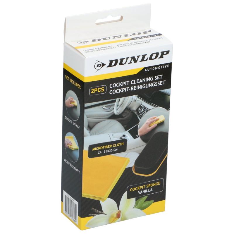 Dunlop auto tīrīšanas komplekts automašīnas interjera kopšanai, īpaši piemērots paneļa un plastmasas vai gumijoto virsmu tīrīšanai. Komplektā ietilpst speciāls sūklis un mikrošķiedras lupatiņa (35 x 35 cm), kas ne tikai efektīvi attīra, bet arī atjauno un aizsargā virsmas, atstājot patīkamu vaniļas aromātu.