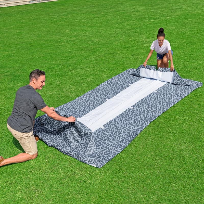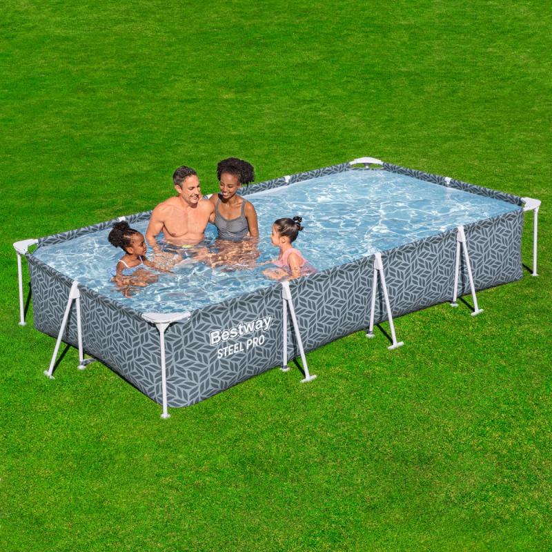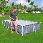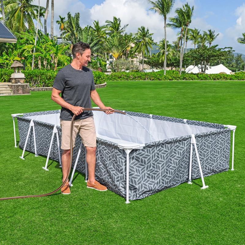 Bestway baseins Steel Pro Frame ir izturīgs un ērti lietojams virszemes baseins ģimenes atpūtai pagalmā. Taisnstūra forma nodrošina maksimālu peldvietas izmantošanu un ļauj bērniem un pieaugušajiem ērti spēlēties, peldēt un atvēsināties karstās vasaras dienās. Pelēkais dizains ar lapu motīvu piešķir baseinam mūsdienīgu un gaumīgu izskatu, kas harmoniski iekļausies dārzā vai terasē.
