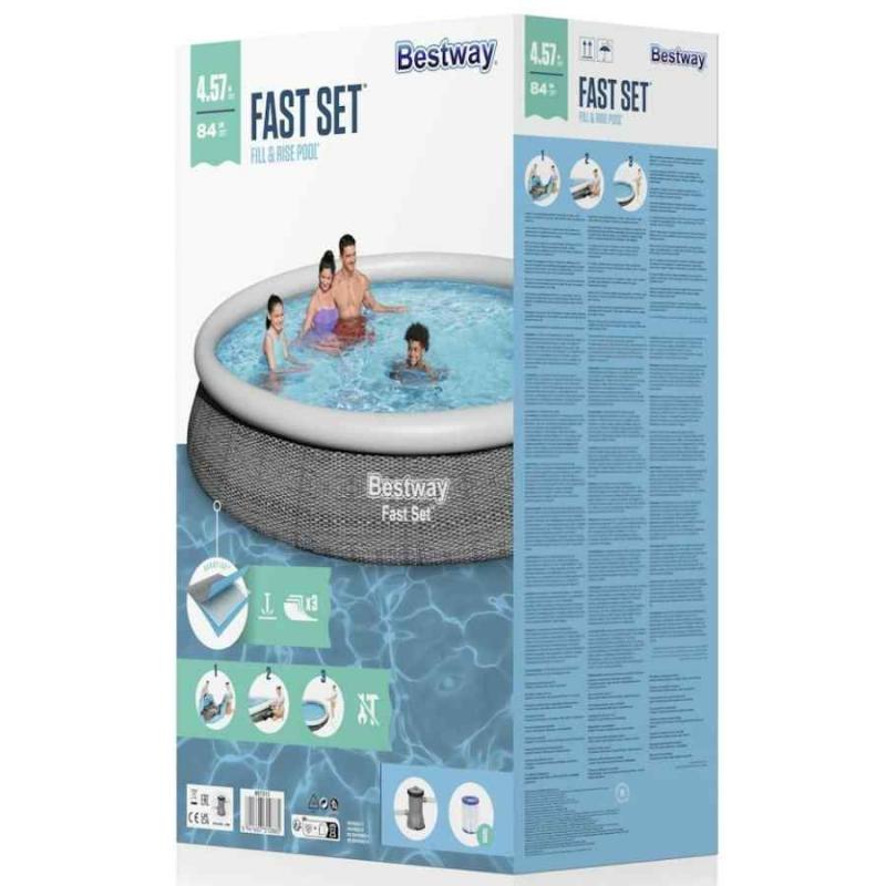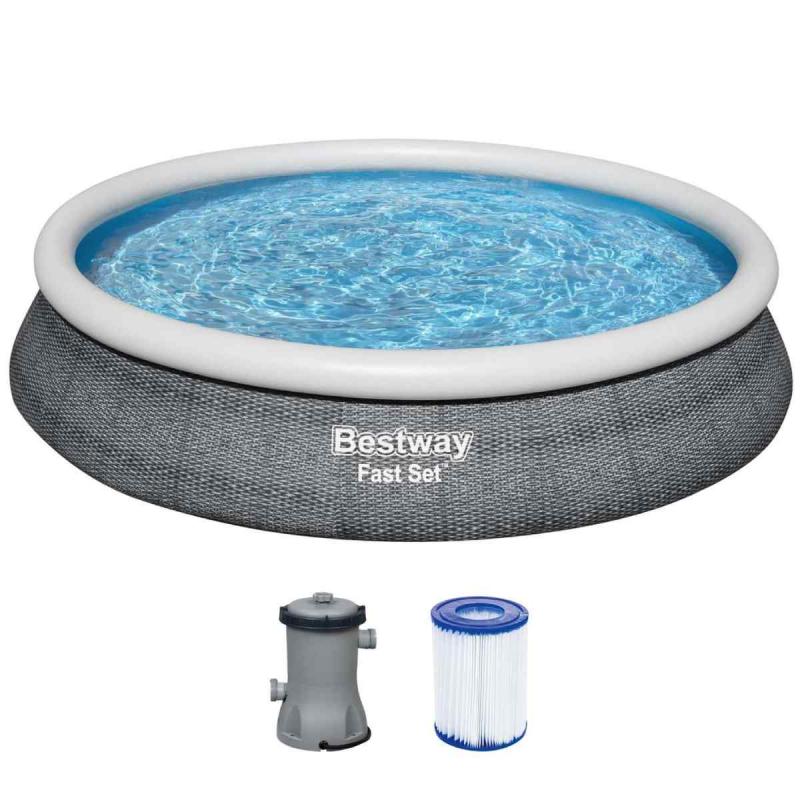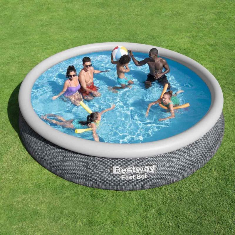 Ar šo parocīgo Bestway® Fast Set™ baseina komplektu Jūs ātri vien būsiet gatavs dienai pie baseina. Vienkārša uzstādīšana - izvēlieties līdzenu virsmu, piepūtiet augšējo gredzenu un baseins pacelsies, kad piepildīsiet to ar ūdeni. Izturīgā baseina starplika izgatavota no izturīga 3 slāņu DuraPlus™ materiāla, kas ir par 85% izturīgāks nekā parastais PVC. No ārpuses baseina apšuvumam ir arī reālistisks šīfera pelēkas rotangpalmas dizains, kas piešķirs dārzam elegantu izskatu. Ūdeni var viegli novadīt, izmantojot integrēto drenāžas vārstu.
