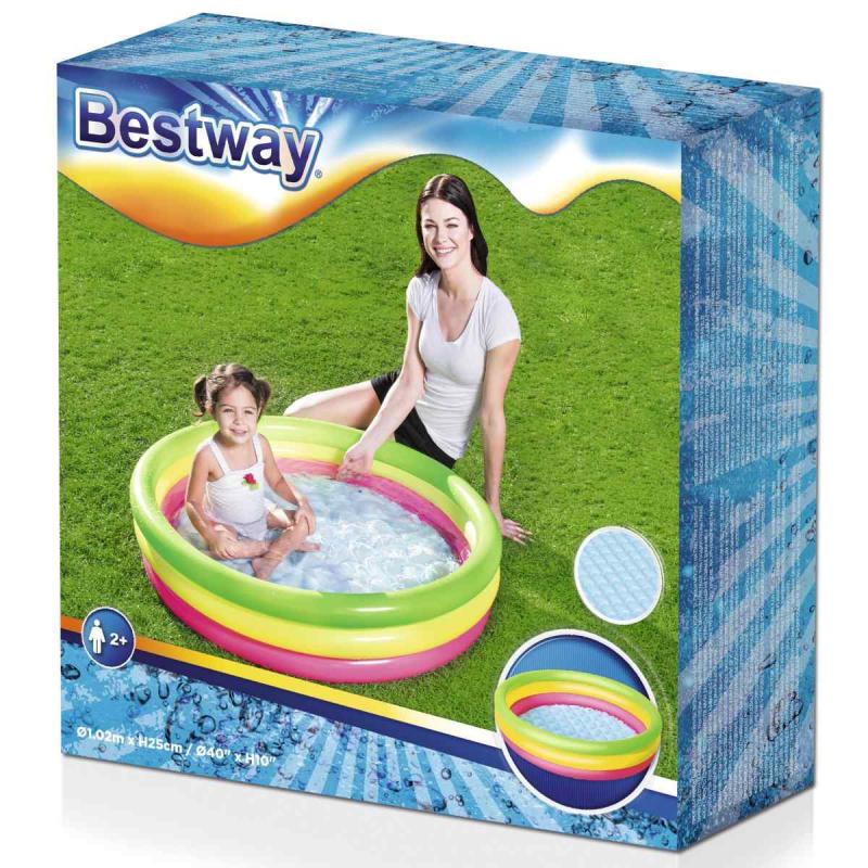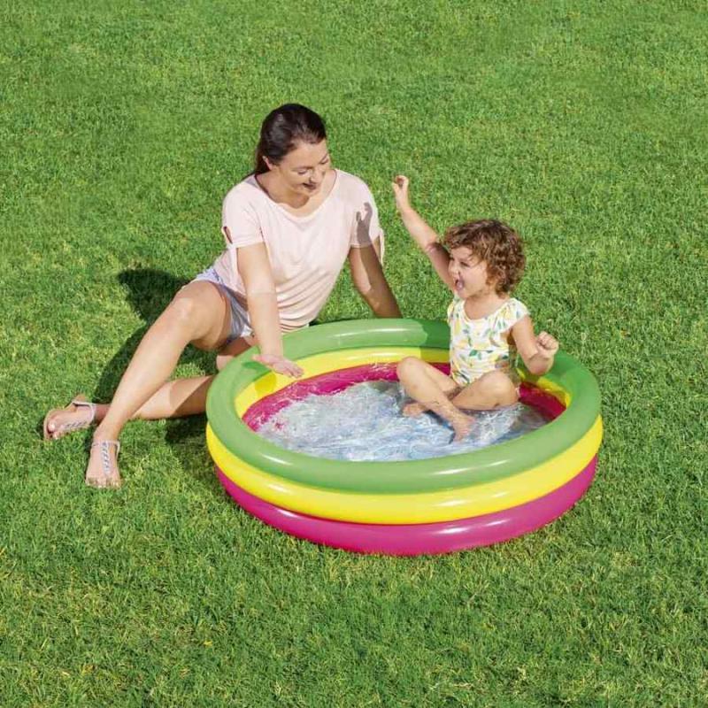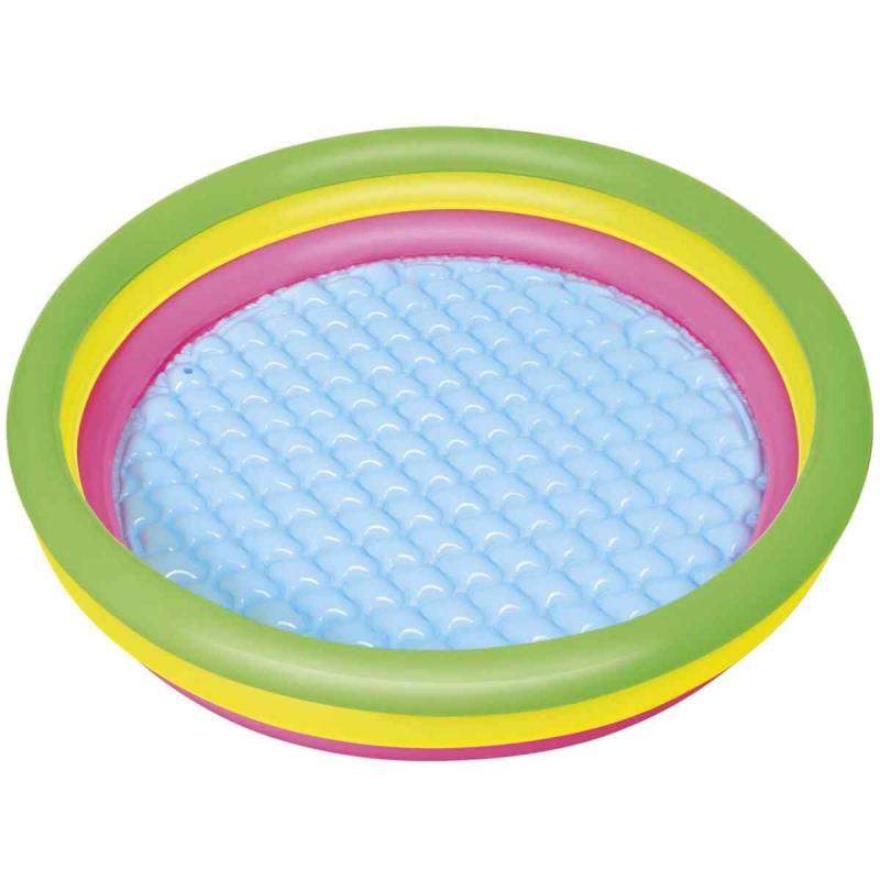 Bestway® Summer Set Baseins ir lieliski piemērots rotaļām un veldzei vasaras saulē. To ir viegli uzstādīt, tam ir trīs gaisa kameras, kuras var ātri piepūst ar gaisa sūkni (nav iekļauts komplektā). Krāsainā konstrukcija ar trim gredzeniem ne tikai piesaista uzmanību, bet arī ir stabila un izturīga. Piepūšamā grīda nodrošina amortizāciju uz cietām grīdām.