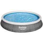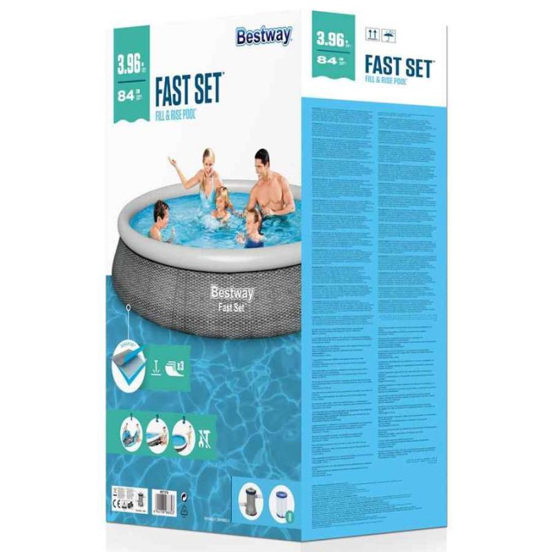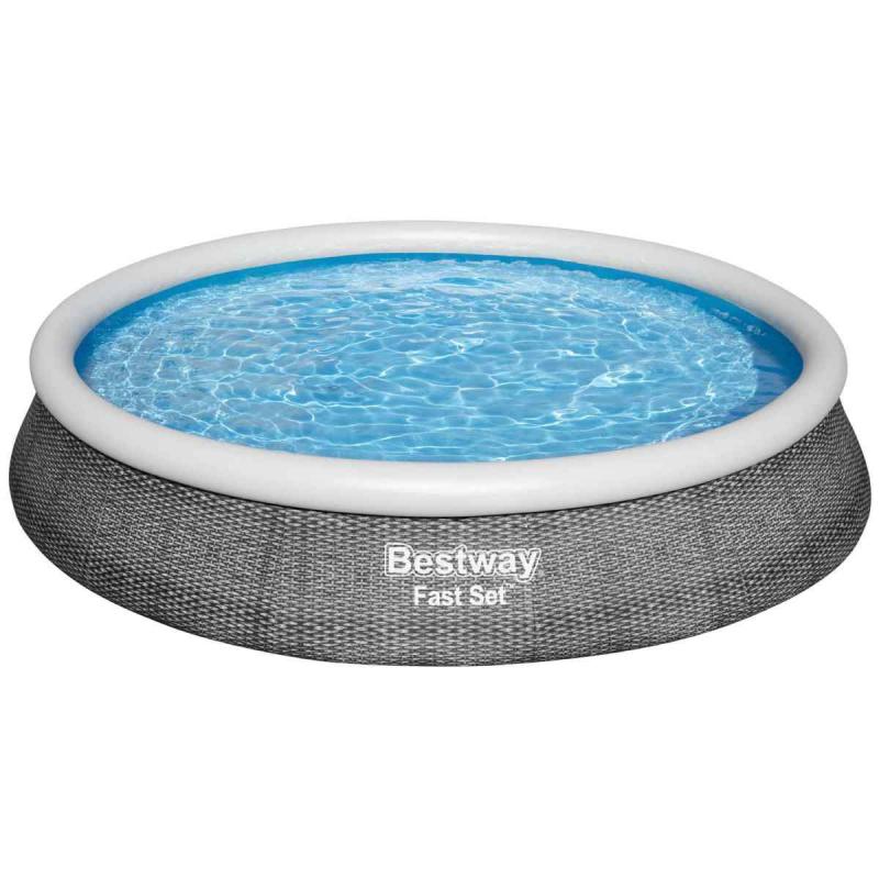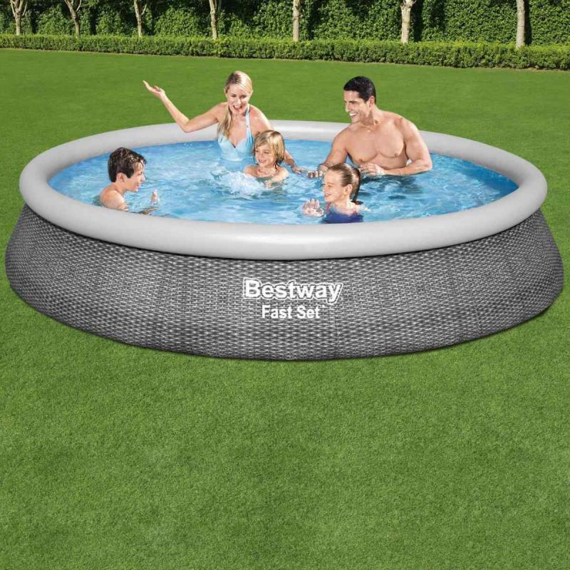 Viegli saliekams Fast Set™ baseina komplekts. Atrodiet līdzenu virsmu, piepūtiet augšējo gredzenu un baseins sakārtosies pats, kad piepildīsies. Izturīgais baseina apšuvums ir izgatavots no pastiprināta 3 slāņu DuraPlus™ materiāla (par 85% izturīgāks pret plīsumiem nekā parastais PVC). No ārpuses baseina apšuvumam ir arī reālistisks šīfera pelēkas rotangpalmas izskats, kas piešķir dārzam elegantu izskatu. Baseina komplektā ietilpst ūdens filtrēšanas sūknis, lai ūdens vienmēr būtu kristāldzidrs un tīrs. Kad peldsezona ir beigusies, uzglabāšana ir ātra un vienkārša. Ūdeni var viegli iztukšot, izmantojot drenāžas vārstu.