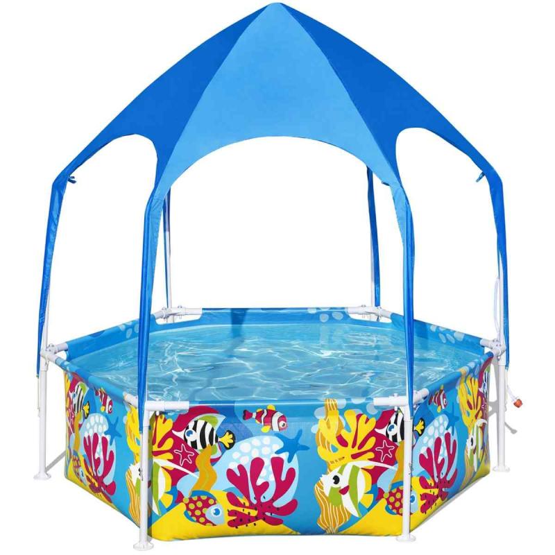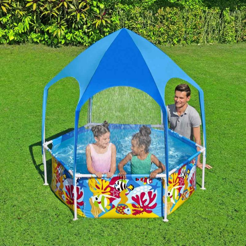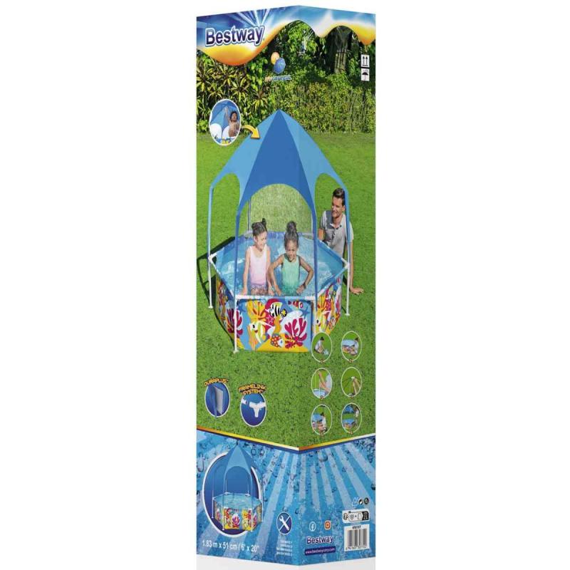 Bestway® Splash-in-Shade Frame baseins saules aizsargjumtu. Īpaši karstās dienās UV Careful™ saules aizsargjumts efektīvi aizsargā bērnus no spēcīgās vasaras saules. Korozijizturīgais tērauda rāmis ir aprīkots ar pārbaudīto FrameLink System™ sistēmu, kas nodrošina spēcīgu un drošu atsevišķu rāmja elementu savienojumu. T veida savienotāji novērš bojājumus no rūsas izraisoša metāla kontakta ar metālu. Baseina oderējums ir izgatavots no neplīstoša 3 slāņu DuraPlus™ materiāla. Tas ir līdz pat 15% izturīgāks pret plīsumiem, par 33% izturīgāks pret stiepšanu un par 83% izturīgāks pret caurduršanu nekā tradicionālais PVC. Iekļautā saules aizsargjumta UPF vērtība ir 40+ un nodrošina efektīvu aizsardzību pret spēcīgu UV starojumu. Jumta apakšā ir arī ūdens smidzinātājs, vienkārši pievienojiet dārza šļūteni. Baseinam ir iespēja pieslēgt filtru sistēmu (nopērkama atsevišķi). Baseinu var uzstādīt 20 minūtēs un, kad sezona ir beigusies, baseinu var viegli demontēt un pēc uzglabāt. Vienkārši pievienojiet dārza šļūteni d