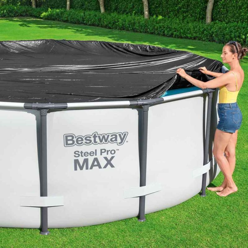 Baseina pārsegs 305 cm Steel Pro™, Steel Pro MAX™ un Fast Set™ baseiniem. Tas efektīvi aizsargā baseina ūdeni no visa veida piesārņojuma. Izgatavots no izturīga, melna PVC materiāla. Tajā ir drenāžas caurumi, lai novērstu ūdens uzkrāšanos. Vieglu uzstādīšanu nodrošina komplektācijā iekļautās stiprinājuma virves.