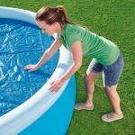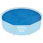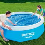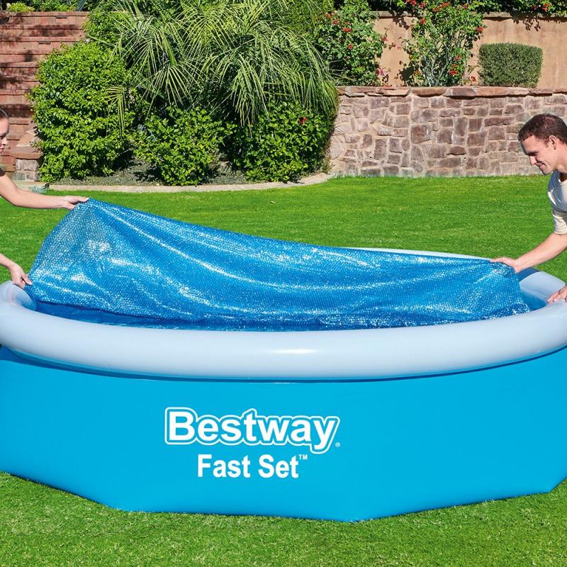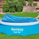 Bestway® Flowclear™ baseina pārklājs paredzēts 305 cm apaļajiem baseiniem, piemēram, Fast Set™ un Steel Pro™ modeļiem. Šis pārklājs efektīvi izmanto saules enerģiju, lai sildītu baseina ūdeni un novērstu siltuma zudumus, vienlaikus pasargājot baseinu no netīrumiem, lapām un citiem gružiem.