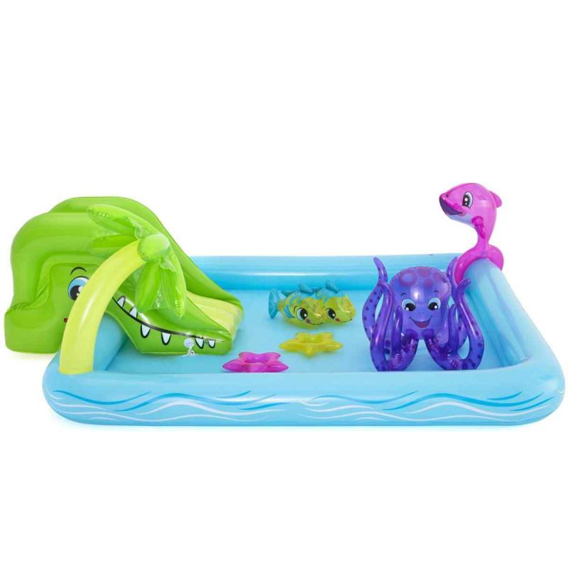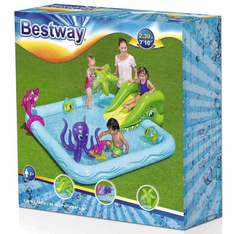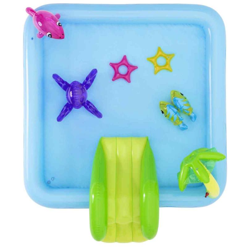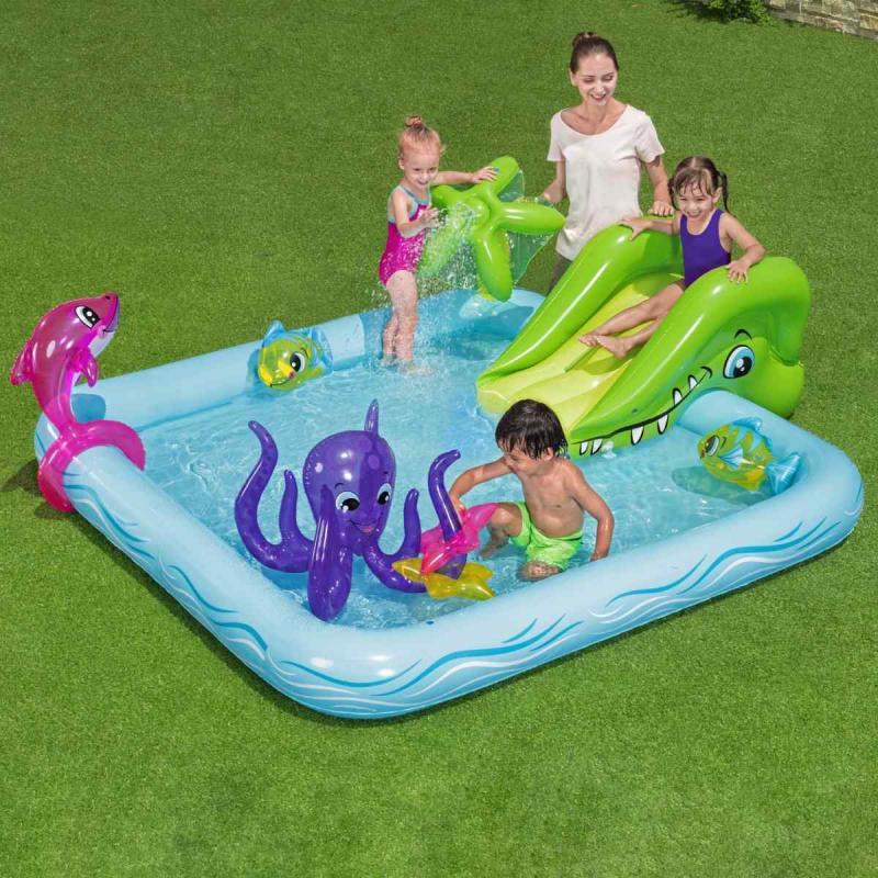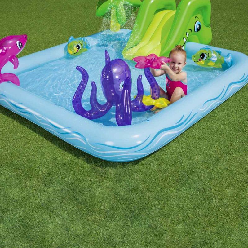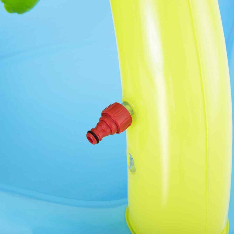 Bestway® rotaļu baseins piedāvā lielisku piemājas aktivitāti, kas nodrošina bezgalīgas jautrības stundas. Mini rotaļu baseins ar jautrām tēmām un daudzām funkcijām ļauj bērniem pētīt un izmantot savu iztēli, būt aktīviem un spēlēties ārā. Pievienojot dārza šļūteni baseina palmai, tā izsmidzinās ūdeni. Bērni baseinā var slidināties pa noņemamo slidkalniņu un spēlēt riņķa mešanas spēli ar komplektā iekļautajiem piepūšamajiem aksesuāriem. Šo rotaļu baseinu ir vienkārši uzstādīt, tam nav nepieciešami instrumenti. Tas viegli piepūšams un iztukšojams, un tam ir iebūvēts ūdens drenāžas vārsts, lai ātri iztecinātu ūdeni.