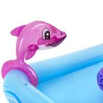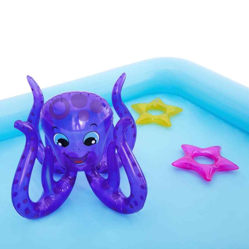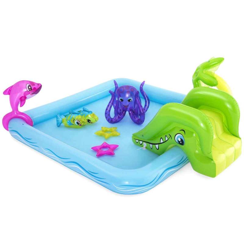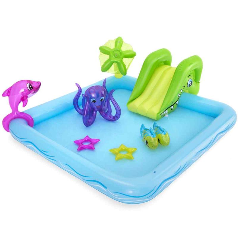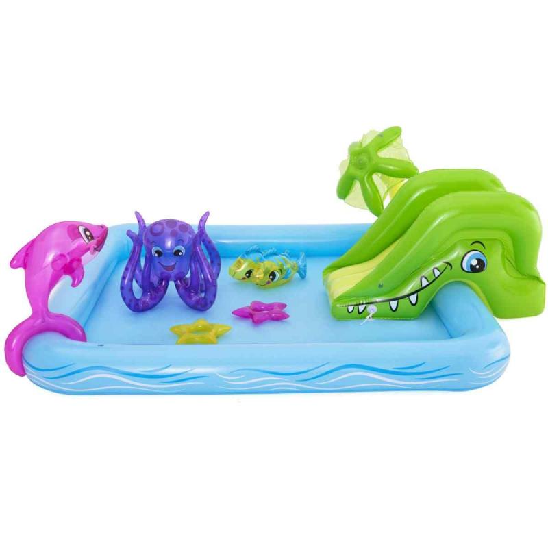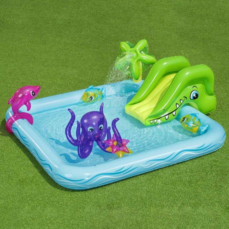Bestway® rotaļu baseins piedāvā lielisku piemājas aktivitāti, kas nodrošina bezgalīgas jautrības stundas. Mini rotaļu baseins ar jautrām tēmām un daudzām funkcijām ļauj bērniem pētīt un izmantot savu iztēli, būt aktīviem un spēlēties ārā. Pievienojot dārza šļūteni baseina palmai, tā izsmidzinās ūdeni. Bērni baseinā var slidināties pa noņemamo slidkalniņu un spēlēt riņķa mešanas spēli ar komplektā iekļautajiem piepūšamajiem aksesuāriem. Šo rotaļu baseinu ir vienkārši uzstādīt, tam nav nepieciešami instrumenti. Tas viegli piepūšams un iztukšojams, un tam ir iebūvēts ūdens drenāžas vārsts, lai ātri iztecinātu ūdeni.