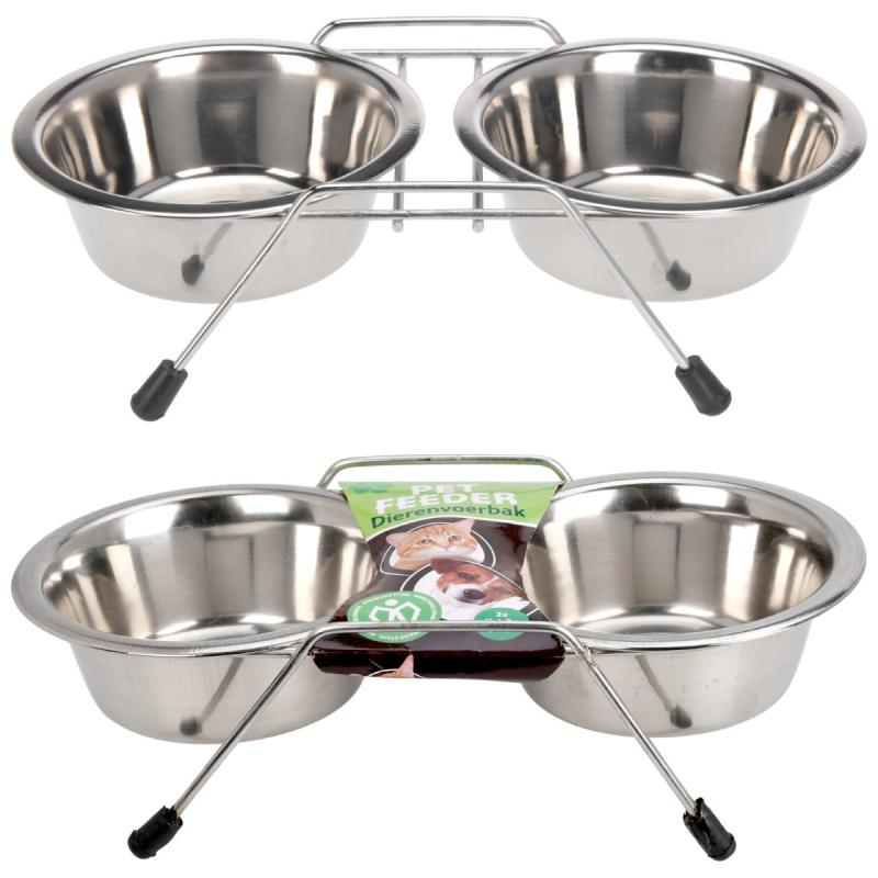 Dzīvnieku bļodu komplekts ar turētāju iekļauj divas nerūsējošā tērauda bļodas, kas paredzētas gan barībai, gan ūdenim. Stabilais metāla statīvs ar gumijas kājiņām novērš slīdēšanu, nodrošinot ērtību un drošību ēdienreižu laikā. Šis komplekts ir praktisks un elegants risinājums gan suņiem, gan kaķiem. Bļodas tilpums 200 ml, diametrs 11 cm un augstums 4 cm, kopējais izmērs ar turētāju 23.5 x 11 x 7 cm.