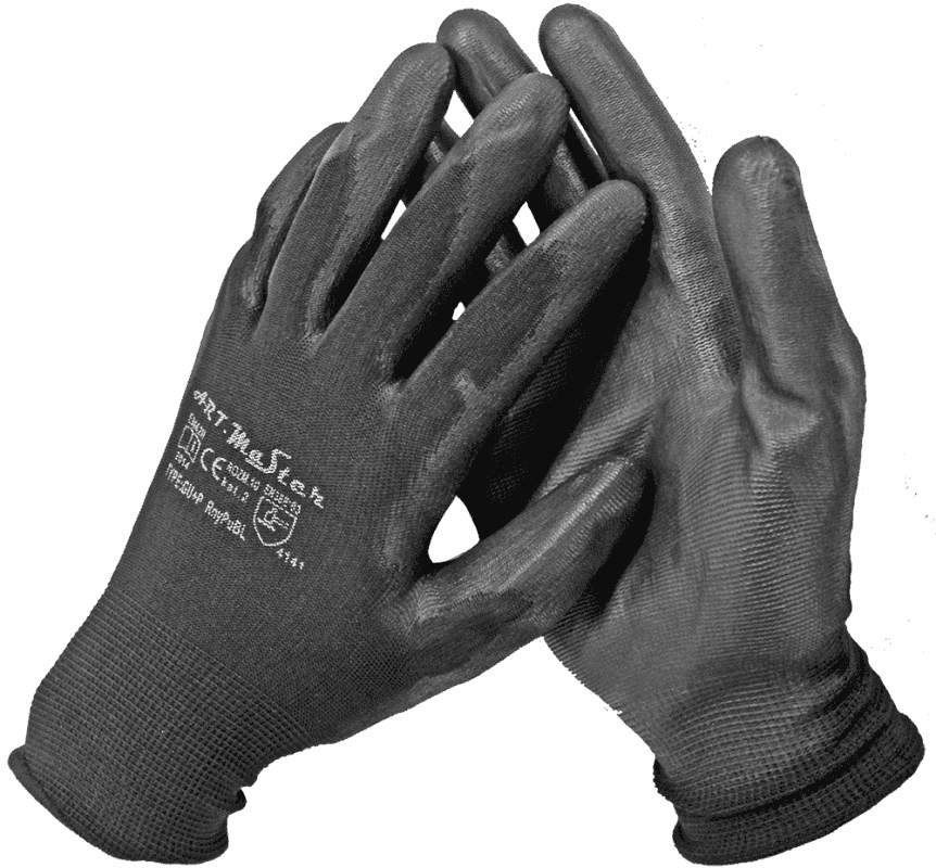 Cimdi poliester ar melnu PU pārkl. 10.izm B+B