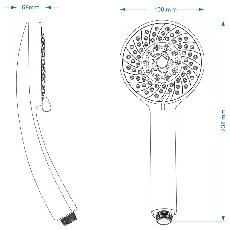 AB dušas klausule hromētā krāsā ar 5 režīmiem piedāvā luksusa klases dušošanās pieredzi ar maksimālu daudzpusību un komfortu. Šī augstās kvalitātes dušas galviņa ir aprīkota ar pieciem dažādiem ūdens plūsmas režīmiem, kas nodrošina plašas pielāgošanas iespējas no maigas strūklas līdz intensīvai masāžai. Koncentrisks strūklu izvietojums ar centrālo masāžas zonu un vairākām apkārtējām strūklu zonām ļauj izvēlēties ideālo kombināciju katrai dušošanās reizei. Hromētais virsmas pārklājums garantē ne tikai elegantu un spožu izskatu, bet arī ilgstošu izturību pret koroziju un vienkāršu ikdienas kopšanu. Dušas galvas diametrs 10 cm, kopējais augstums 23.7 cm, G1/2 collu pieslēgums.