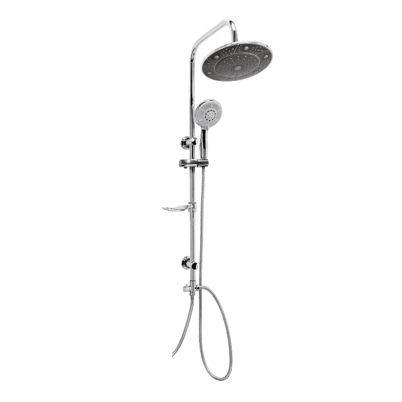 Dušas galva 24 cm un 5 funkciju dušas klausule 12 cm, (normāla plūsma, hidromasāža, migla,spēcīga strūkla, jaukta plūsma), pretkaļķa sistēma. Krāsa hroma/melna.