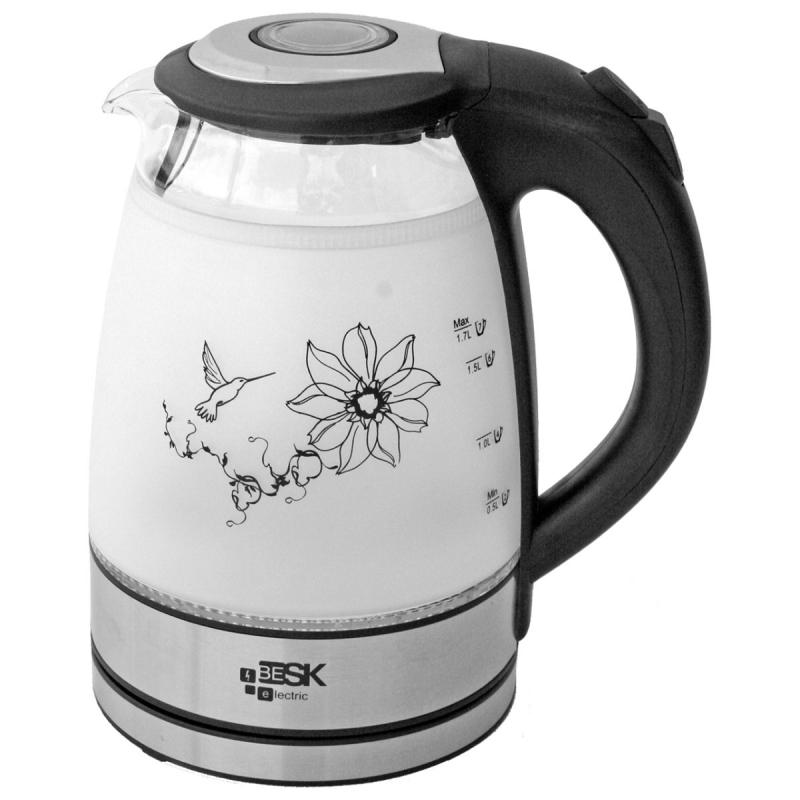 Elektriskā tējkanna ar stikla korpusu un dekoratīvu kolibri un zieda zīmējumu. Melnais plastmasas rokturis un vāks nodrošina ērtu un drošu lietošanu, kamēr ūdens līmeņa atzīmes uz korpusa atvieglo precīza ūdens daudzuma ieliešanu. Šī tējkanna lieliski iederas jebkurā virtuvē, apvienojot estētisku dizainu ar praktiskumu. Tējkannas tilpums 1.7 l.