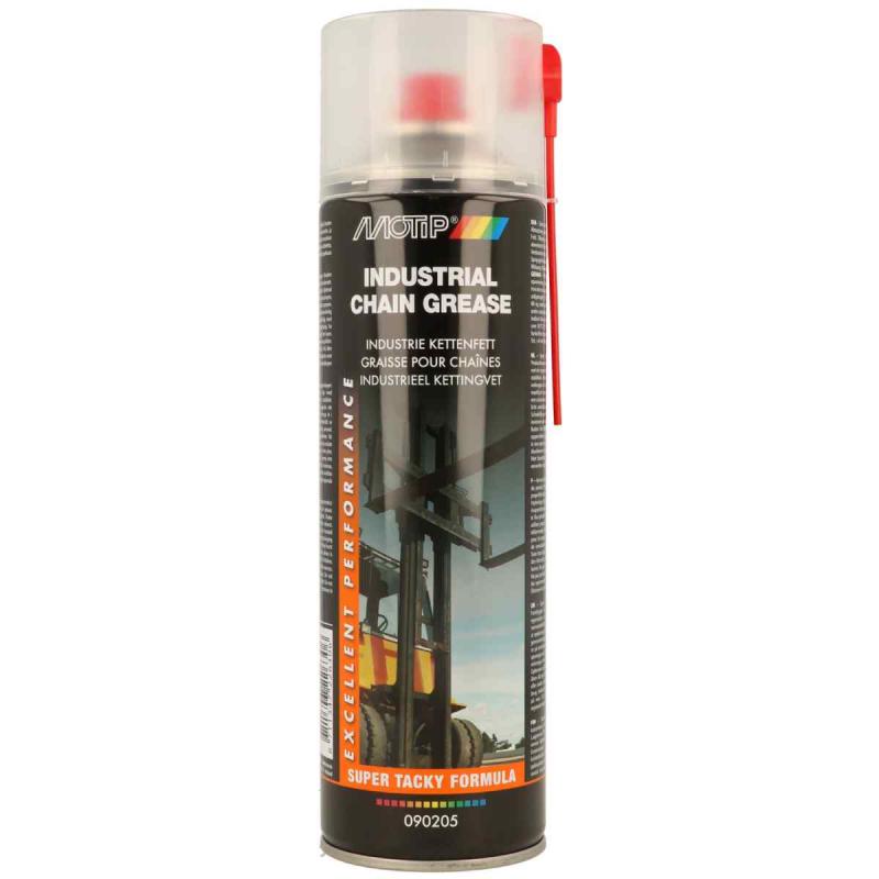 Ieeļļojiet ķēdes piedziņas transmisijas, kas ir pakļautas lielai slodzei, ar Motip Industrial Chain Grease. Rūpniecisko ķēžu smērvielu var apstrādāt kā eļļu, ar smērvielu īpašībām. Izcila mehāniskā un termiskā stabilitāte, novērš nodilumu un pielipšanu, ūdeni atgrūdošs. Smērvielai ir laba saķere, tā ir izturīga pret laika apstākļu ietekmi, vājām skābēm un bāzēm. Labākā apstrādes temperatūra no 10 līdz 25°C. Pirms lietošanas aerosolu sakratiet. Uzklājiet rūpniecisko ķēdes smērvielu plānā kārtā. Sākotnējā plūsmas fāzē, kad aerosols patiešām var iekļūt apstrādātajā ķēdē, aerosolam ir putojošs efekts. Optimālu eļļošanu iegūst pēc šķīdinātāja iztvaikošanas.