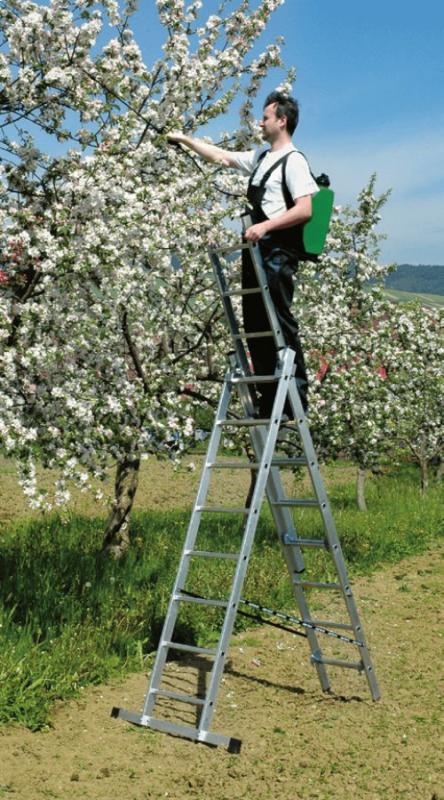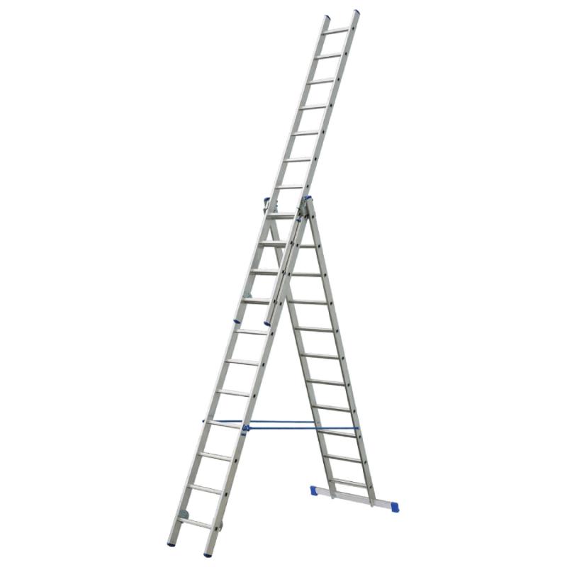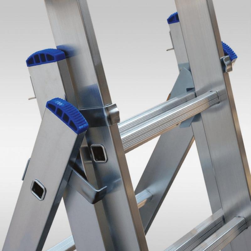 Trīsposmu alumīnija daudzfunkcionālas kāpnes, kas izmantojamas kā slīpas, pagarināmas un pakāpienu kāpnes ar izvelkamu kāpņu daļu. Tērauda eņģes, kas nodrošina vienkāršu un drošu kāpņu pagarināšanu. Drošības bloķēšanas siksnas novērš nejaušu kāpņu atvēršanos. Pašbloķēšanas sistēma novērš kāpņu atvēršanos transportēšanas laikā. Pretslīdēšanas kājas nodrošina kāpņu stabilitāti. Piemērotas lietošanai gan telpās, gan ārā.
