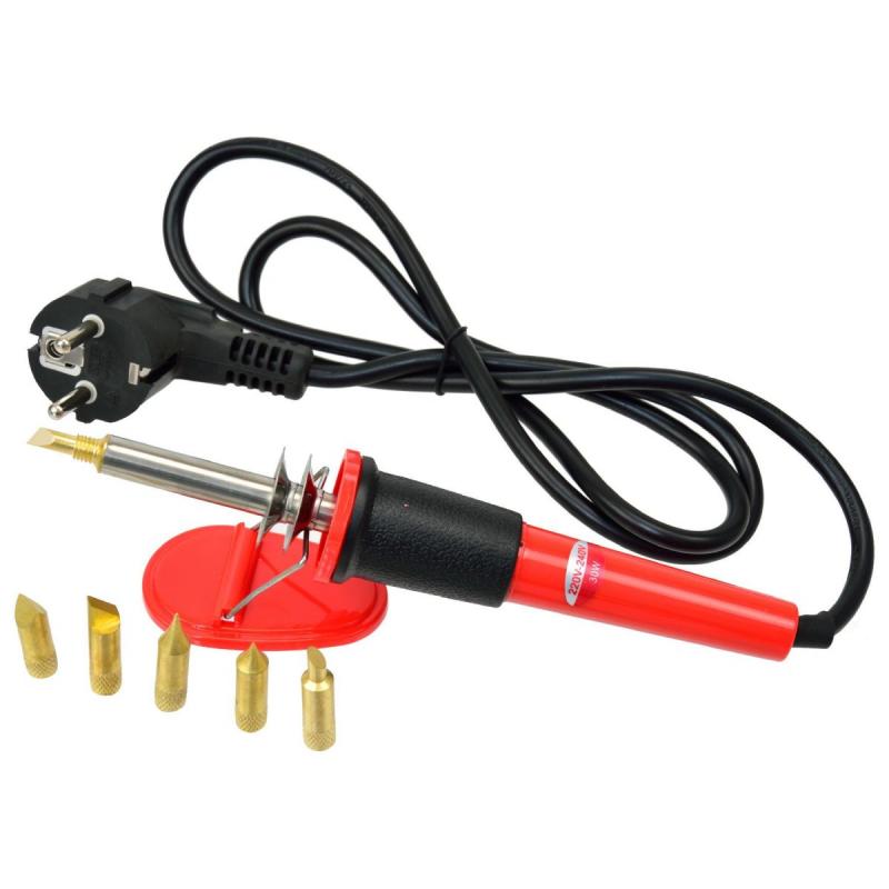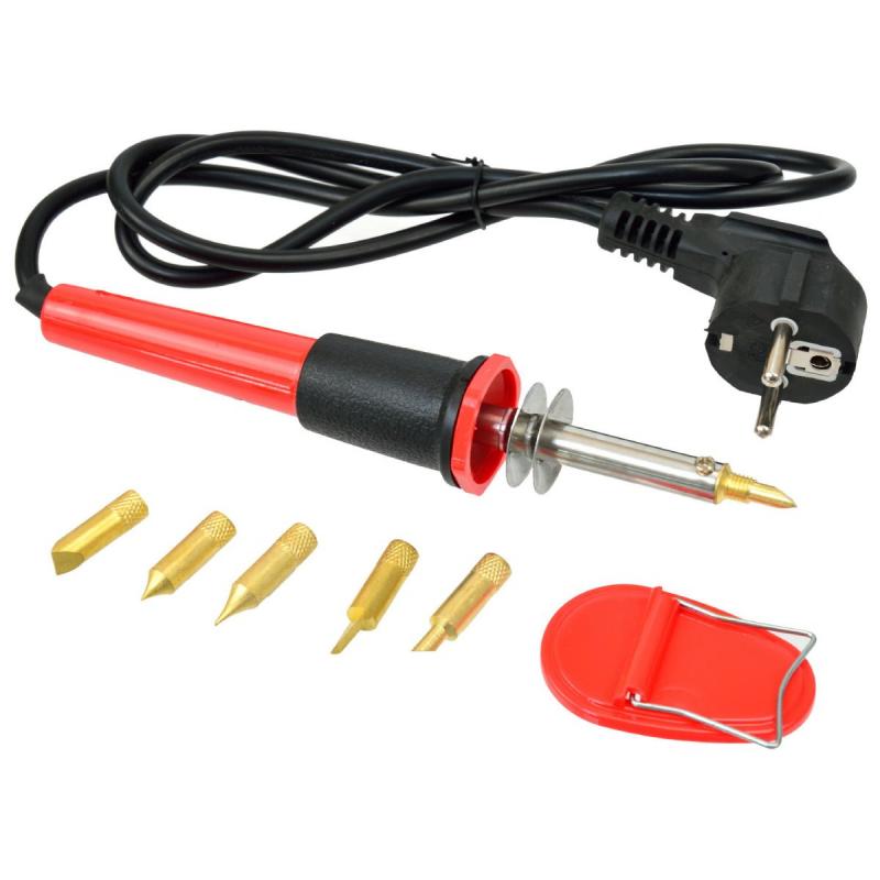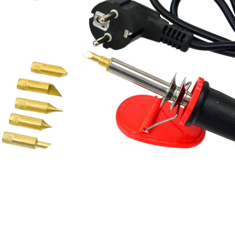 Lodāmurs ar 5 dažādiem uzgaļiem. Piemērots koka lodēšanai, koka apstrādei, vaļaspriekiem un rokdarbiem. Arī malkas dedzināšanai, pirogrāfijai, gravēšanai, griešanai, reljefiem, burtiem un dekorēšanai uz koka, kažokādas, korķa un ādas. Karstumizturīgs un triecienizturīgs rokturis. Lodāmura uzgaļi, viegli nomaināmi un lietojami. Komplektā 5 koka dedzināšanas uzgaļi un plastmasas statīvs