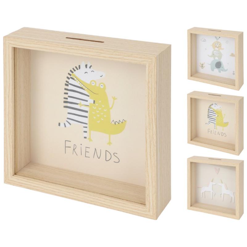 Koka krājkase kastīte ir gaumīgs un mīļš veids, kā uzglabāt ietaupījumus un vienlaikus rotāt interjeru. Tā veidota no dabīga koka ar caurspīdīgu priekšpusi, kas ļauj redzēt sakrāto naudu, radot papildu motivāciju taupīt. Dekoratīvie attēli ar dzīvniekiem piešķir tai rotaļīgu un sirsnīgu noskaņu, padarot to īpaši piemērotu bērnu istabai vai kā dāvanu. Izmērs 20 x 20 x 5 cm nodrošina pietiekami daudz vietas monētām un banknotēm, vienlaikus saglabājot kompaktu un estētisku izskatu.