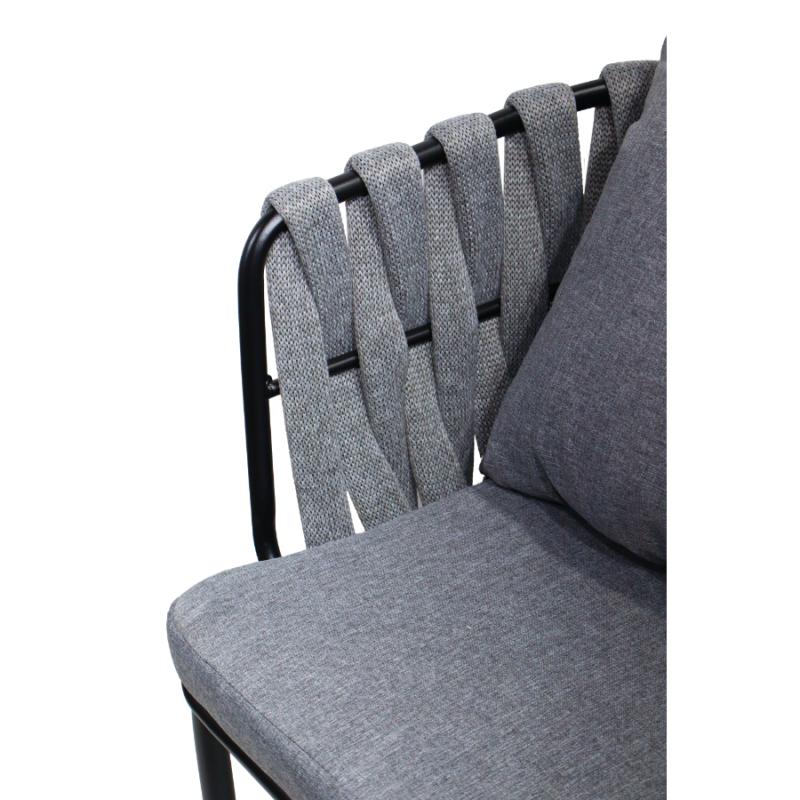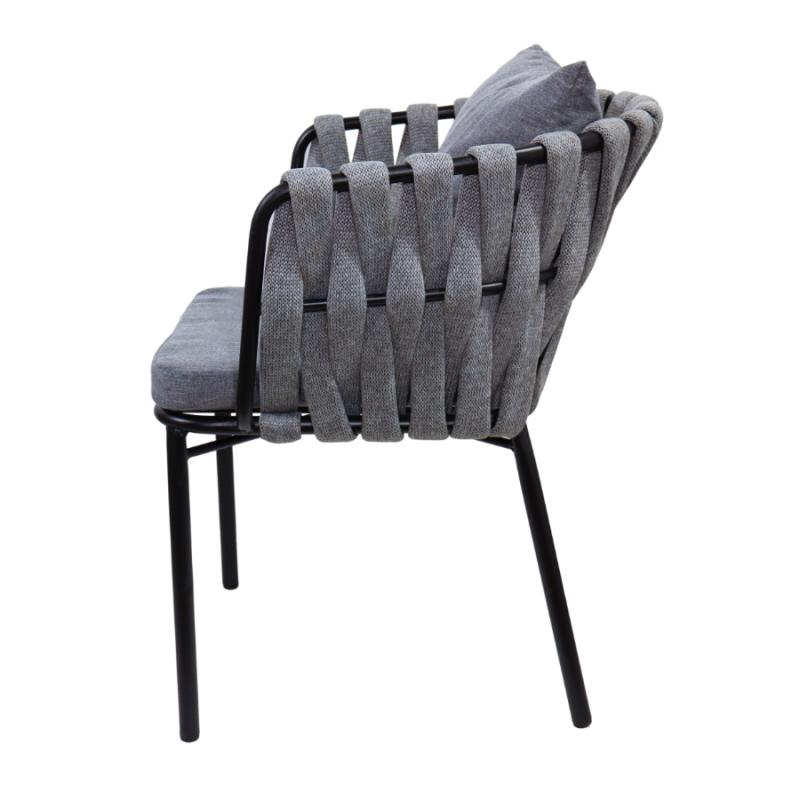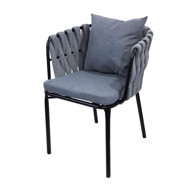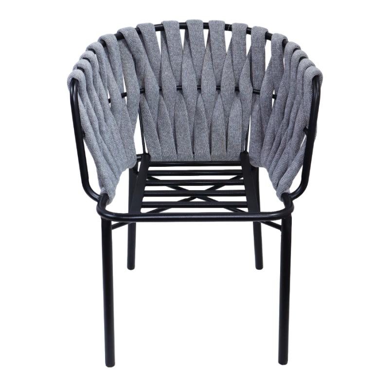 Atpūtas krēsls ar mūsdienīgu un elegantu dizainu, kas apvieno komfortu ar stilīgu izskatu. Konstrukcija veidota no izturīga metāla ar melnu pulverkrāsojumu, savukārt muguras un sānu daļas rotā adītas trikotāžas lentas, kas ne tikai piešķir krēslam unikālu vizuālo tēlu, bet arī nodrošina ergonomisku atbalstu. Komplektā ietilpst mīksts sēdekļa un atzveltnes spilvens, kas nodrošina papildu komfortu ilgstošai atpūtai gan iekštelpās, gan ārā. Izmērs 58 x 74 cm.