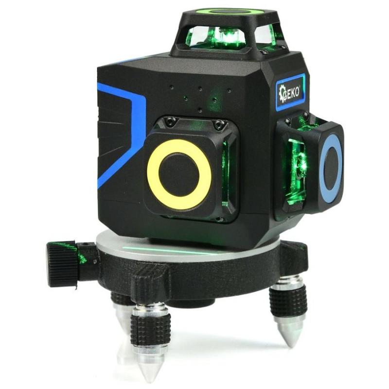Geko krustlīniju lāzers ir profesionālas klases instruments precīzai līmeņošanai un pozicionēšanai gan būvniecībā, gan apdares un montāžas darbos. Zaļās lāzera līnijas ir īpaši spilgtas un labi saskatāmas pat intensīvā apgaismojumā, nodrošinot līdz pat 30 metru darba diapazonu. Ierīce projicē trīs 360° līnijas (vienu horizontālo un divas vertikālās), kas veido pilnīgu 3D projekciju, ļaujot vienlaikus strādāt dažādos virzienos un plaknēs bez instrumenta pārvietošanas. Lāzers aprīkots ar pašizlīdzināšanās funkciju, kas automātiski koriģē nelielas novirzes līdz ±4°, nodrošinot precīzu staru pozīciju. Iespējams izmantot arī slīpuma režīmu (slope mode), kas ļauj projicēt līnijas leņķī, piemēram, margu vai kāpņu uzstādīšanā. Pulse režīms dod iespēju lietot lāzeru kopā ar uztvērēju, kas ir īpaši noderīgi ārā vai lielos attālumos. Iebūvētā OSRAM diode nodrošina augstu staru kvalitāti un ilgstošu darbības stabilitāti, savukārt integrētā 4000 mAh litija jonu baterija ar Type-C uzlādes portu garantē līdz pat 6 stundu