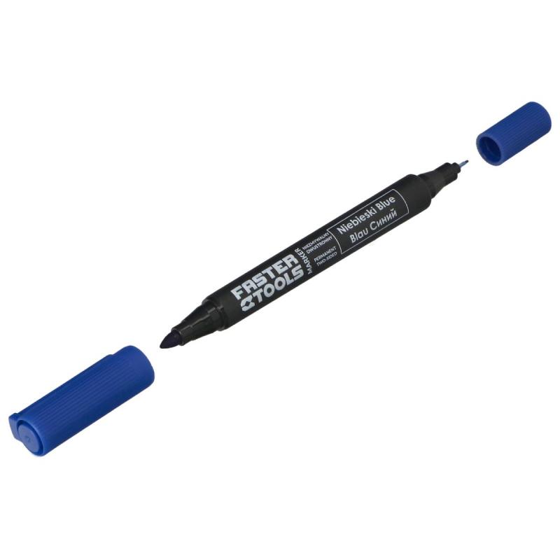 Faster Tools divpusējais marķieris ir paredzēts daudzpusīgai marķēšanai uz dažādām virsmām. Tā divi dažādie gali ar 0.6 mm un 1.2 mm diametru ļauj izvēlēties vajadzīgo līnijas biezumu. Marķiera tinte ir noturīga pret gaismu, ūdeni un nodilumu, kas garantē skaidru un ilgstošu marķējumu. Šis marķieris ir lieliski piemērots lietošanai gan birojā, gan mājās un darbnīcā. Marķieris ir izturīgs pret daudziem šķīdinātājiem un lakām. Izmērs 140 x 12 mm, krāsa zila.