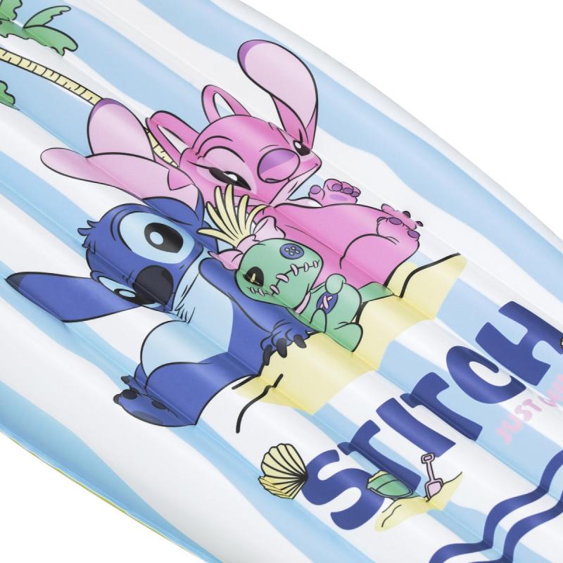 Matraci rotā košs Disney Lilo & Stitch dizains ar draudzīgiem varoņiem un pludmales motīviem, kas uzbur Havaju noskaņu un iedrošina bērnu doties ūdenī. Zilbalti svītrainais fons un spilgtie tēli padara peldmatraci labi pamanāmu ūdenī, kas ir gan drošības, gan vizuāls ieguvums. Tas ir lieliski piemērots bērniem vecumā no 3 līdz 10 gadiem un palīdz attīstīt drošības sajūtu ūdenī, apvienojot spēli un atpūtu.