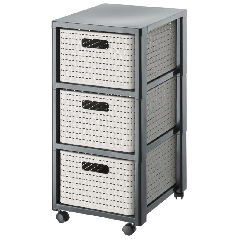 Rotho plastmasas plaukts Country ar 3 atvilktnēm ir praktisks un estētisks risinājums mājas vai biroja kārtības uzturēšanai. Plaukts antracīta un gaiši brūnā krāsā piešķir telpai elegantu, modernu akcentu, kas harmoniski iederas dažādos interjeros. Trīs ietilpīgās, izņemamās atvilktnes ar rotangam līdzīgu pinuma dizainu nodrošina ērtu vietu drēbēm, rotaļlietām vai dokumentiem, katras groza izmērs 36.8 x 27.8 x 19.2 cm. Četri ritenīši ļauj plauktu viegli pārvietot, savukārt izturīgā plastmasas konstrukcija nodrošina stabilitāti un ilgmūžību. Kopējais plaukta izmērs 37.5 x 32.5 x 71.2 cm.