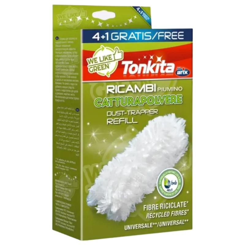 Tonkita We Like Green putekļu slotiņas rezerves ir ekoloģiskas putekļu savākšanas uzgaļu papildinājums, kas izgatavots no pārstrādātām šķiedrām. Biezās, īpaši pūkainās un elektrostatiskās šķiedras kopā ar 3D reljefa joslām savāc putekļus, matus un sīkus netīrumus no dažādām virsmām, nodrošinot rūpīgu un ātru uzkopšanu. Mīkstās un elastīgās šķiedras viegli piekļūst šauriem stūriem un spraugām, tādēļ rezerves uzgaļi ir ideāli piemēroti mēbeļu, plauktu, žalūziju, lampu, televizoru un datoru virsmu regulārai putekļu tīrīšanai. Šie uzgaļi pagarina esošās putekļu slotiņas kalpošanas laiku un samazina atkritumu daudzumu, vienlaikus saglabājot augstu tīrīšanas kvalitāti.