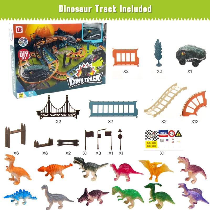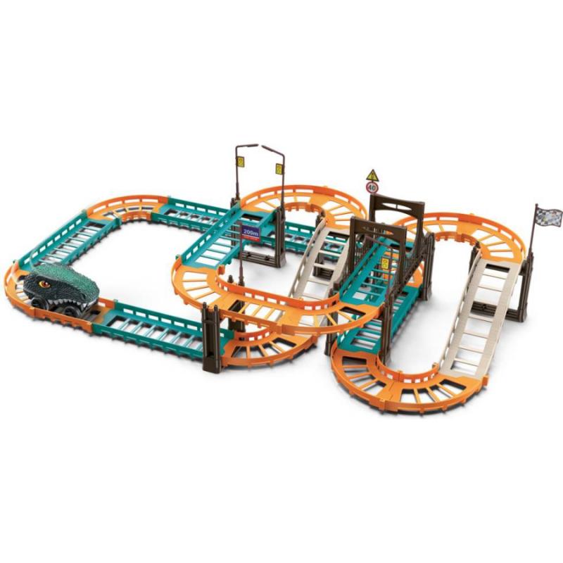 Dinozauru tematikas sacīkšu trase ar 49 detaļām sniedz aizraujošu un radošu spēles pieredzi bērniem, kas interesējas par piedzīvojumiem un dinozauriem. Komplektā ietilpst uzstādāma trase ar daudzlīmeņu posmiem, tiltiem, ceļa zīmēm un kustīgu auto, kā arī vairāki rotaļu dinozauri lomu spēlēm. Trases elementus iespējams savienot dažādās kombinācijās, veicinot bērna radošumu un roku veiklību. Izgatavota no izturīgas plastmasas, šī rotaļlieta ir piemērota bērniem no 3 gadu vecuma.