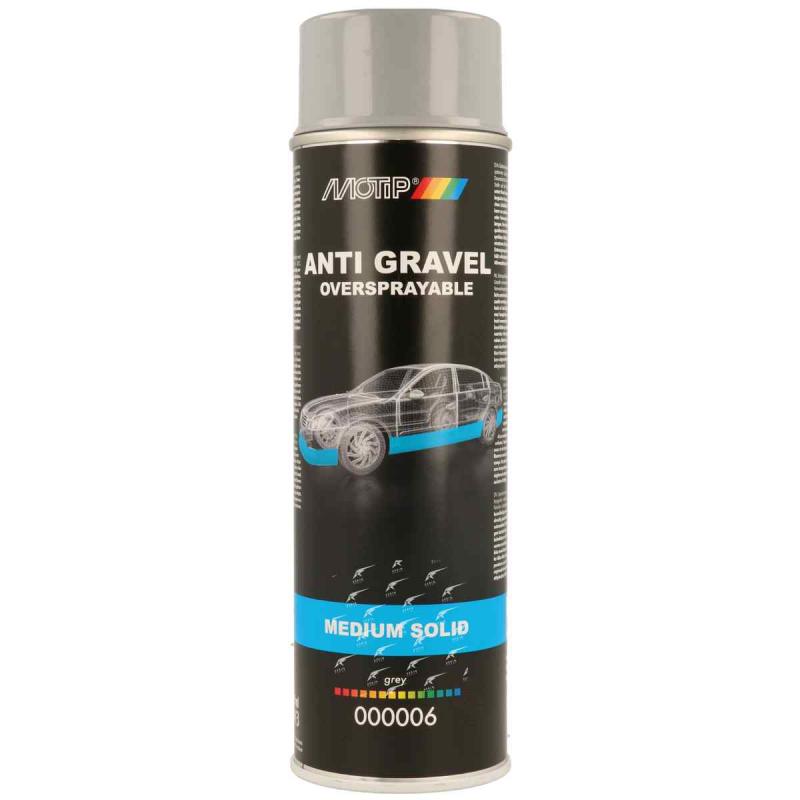 Aizsargājiet automašīnas grīdu un redzamās virsbūves daļas pret šķembām ar Motip Stone Chip Spray. Līdzekli var atkārtoti izsmidzināt uz visām krāsām un tas novērš rūsu. Tas ir izturīgs pret laikapstākļiem, vājām skābēm un bāzēm, ir skaņu absorbējošs un saglabā elastību. Krāsa pelēka, tilpums 500 ml.