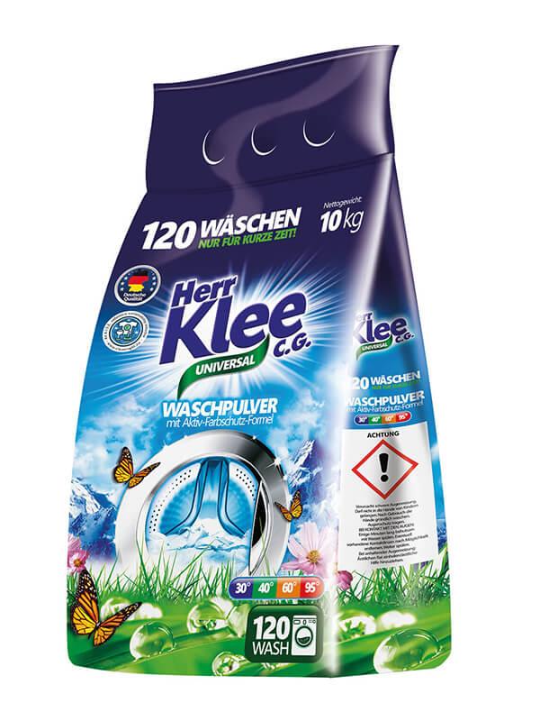 Veļas pulveri Herr Klee Universal var izmantot gan baltiem, gan krāsainiem audumiem. Tas ir ārkārtīgi efektīvs. 10 kg iepakojums ir pietiekams līdz 120 mazgāšanas reizēm. Pulverim ir pārsteidzošs, svaigs aromāts. Veļas pulveris ļoti labi šķīst ūdenī. Tas neizraisa alerģijas un nekairina ādu. Herr Klee Universal satur atkaļķošanas līdzekli, tāpēc mazgājot nav nepieciešams papildus izmantot atkaļķošanas līdzekli. Mazgāšanas temperatūras diapazons no 30°C līdz 95°C.