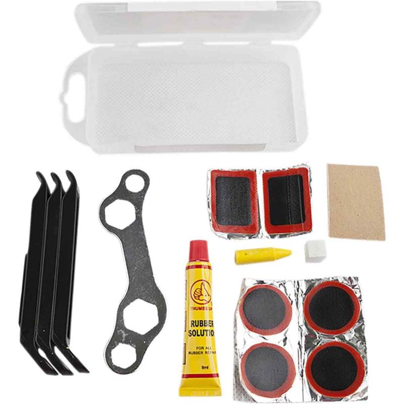 Good Bike velosipēda remonta komplekts ir praktisks un kompakts komplekts ikvienam velobraucējam, kurā ietilpst viss nepieciešamais cauru riepu ātrai un efektīvai salabošanai. Komplektā ir 6 ielāpi (2 apaļi un 4 taisnstūrveida), smilšpapīrs riepas sagatavošanai, 8 ml līme ielāpu pielīmēšanai, krītiņš bojājuma iezīmēšanai, 3 plastmasas lāpstiņas riepas noņemšanai, kā arī uzgriežņu atslēgas un uzglabāšanas futlāris, kas ļauj visus instrumentus ērti glabāt un paņemt līdzi ceļā.