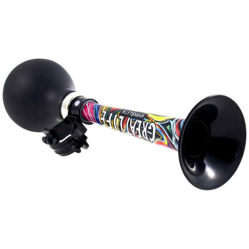 Good Bike velosipēda taure ar krāsainu grafiti dizainu ir spilgts un praktisks aksesuārs, kas palīdz uzlabot drošību un piešķir braucienam personību. Taure rada skaļu un skaidru signālu, kad tiek saspiesta tās gumijas bumba, kas ļauj to ērti izmantot arī bērniem. Tā piestiprināma pie velosipēda vai skrejriteņa stūres ar izturīgu metāla kronšteinu, kas der stieņiem līdz 2 cm diametrā. Universālais izmērs 21.5 cm padara šo tauri piemērotu dažādu izmēru velosipēdiem, savukārt košais dizains padara braucēju pamanāmāku uz ceļa.