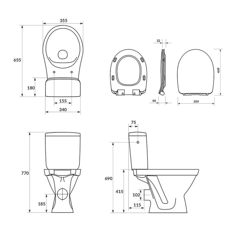 Tualetes pods ar novatorisko keramikas profilēšanas sistēmu SimpleOn. Šim risinājumam raksturīga ir unikāla mēles forma apamle, no kuras izplūst ūdens. Ūdens plūst no abām pusēm pretējos virzienos un satiekas poda priekšpusē. Pateicoties tam, viss tiek rūpīgi izmazgāts un iztīrīts. Tas ļauj uzlabot higiēnu vannas istabā, likvidējot kaļķakmens, baktērijas, nogulsnes un visus piemaisījumus tualetes poda iekšienē. Tualetes podam ir 3/6 l skalošanas sistēma, horizontāls kanalizācijas izvads un ūdens padeve skalojamai kastei no sāniem. Komplektā ietilpst arī plāns Soft-Close (lēni aizveras) duroplasta tualetes poda vāks, kas aprīkots ar Easy-Off (viegli demontējams) sistēmu. Tualetes poda dziļums 65.5 cm, platums 35.5 cm, augstums 77 cm.