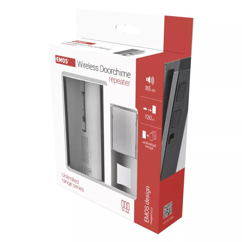 Tālvadības zvans EMOS P5763. Tā ūdensizturīgā poga un durvju zvans savā starpā sazinās ar radioviļņu starpniecību līdz 120 m attālumā. Pateicoties integrētajam signāla retranslatoram, varat pievienot papiluds uztvērējus un neierobežoti paplašināt ierīces darbības diapazonu.