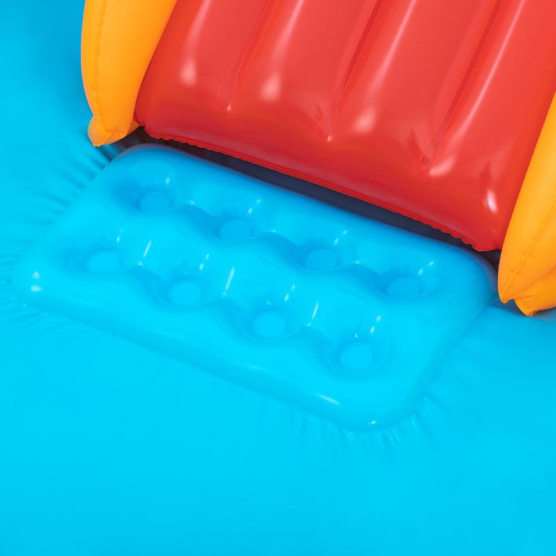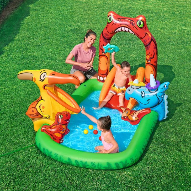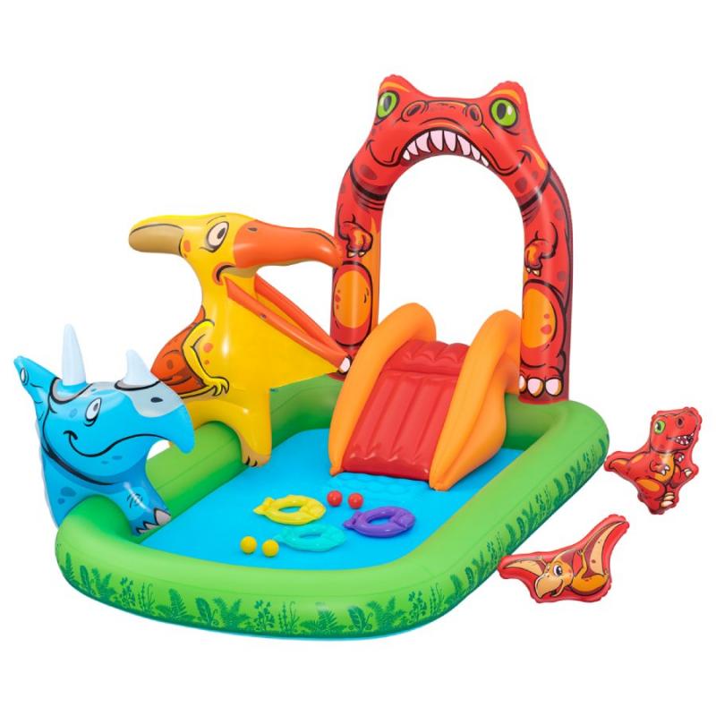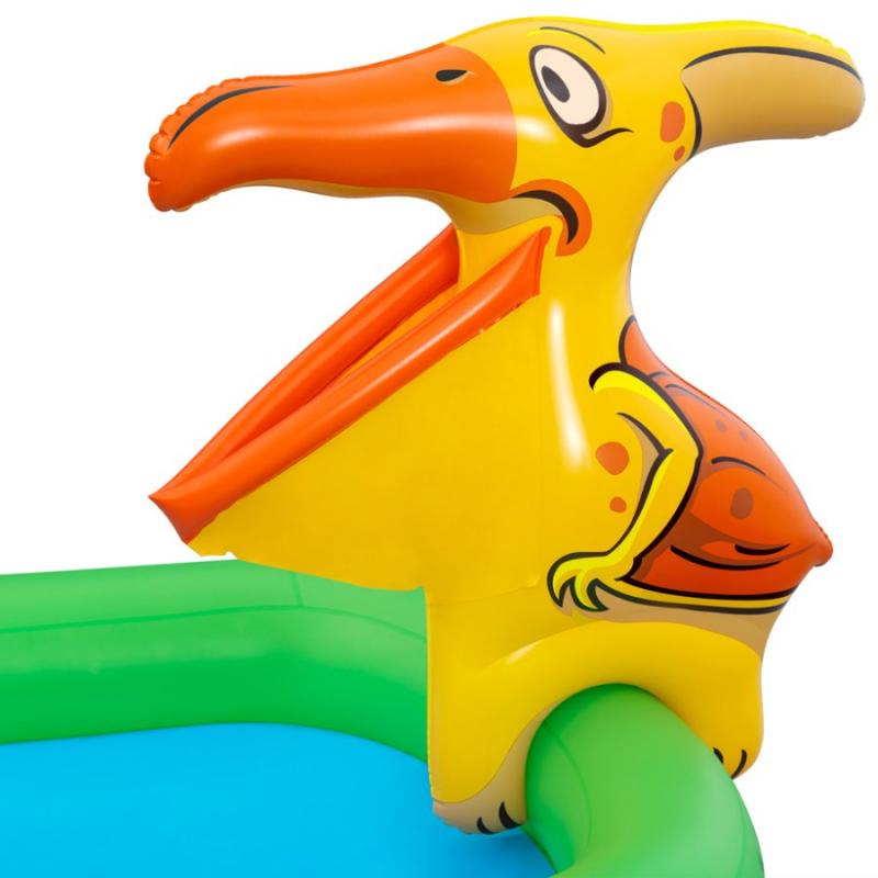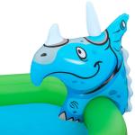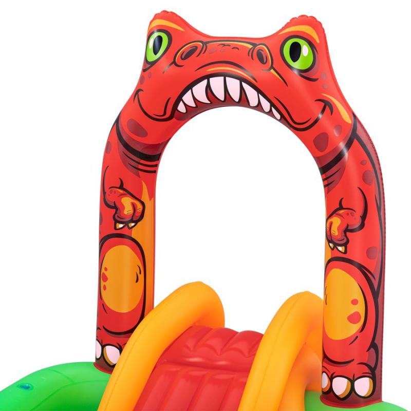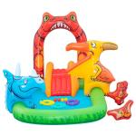 Bestway® Jurassic Splash™ piepūšamais ūdens rotaļu laukums. Slīdkalniņš ar piezemēšanās paliktni, Triceratopa gredzenu mešanas spēle, piepūšamais Pteranodons ar lodīšu mētāšanu un T-Rex ūdens smidzinātājs ar dārza šļūtenes savienojumu garantē stundām ilgu jaurību. Izmērs piepūstā veidā 242 x 140 x 137 cm un ūdens tilpums 190 litri. Izgatavots no izturīga PVC. Tas ir piemērots bērniem no 2 gadu vecuma.