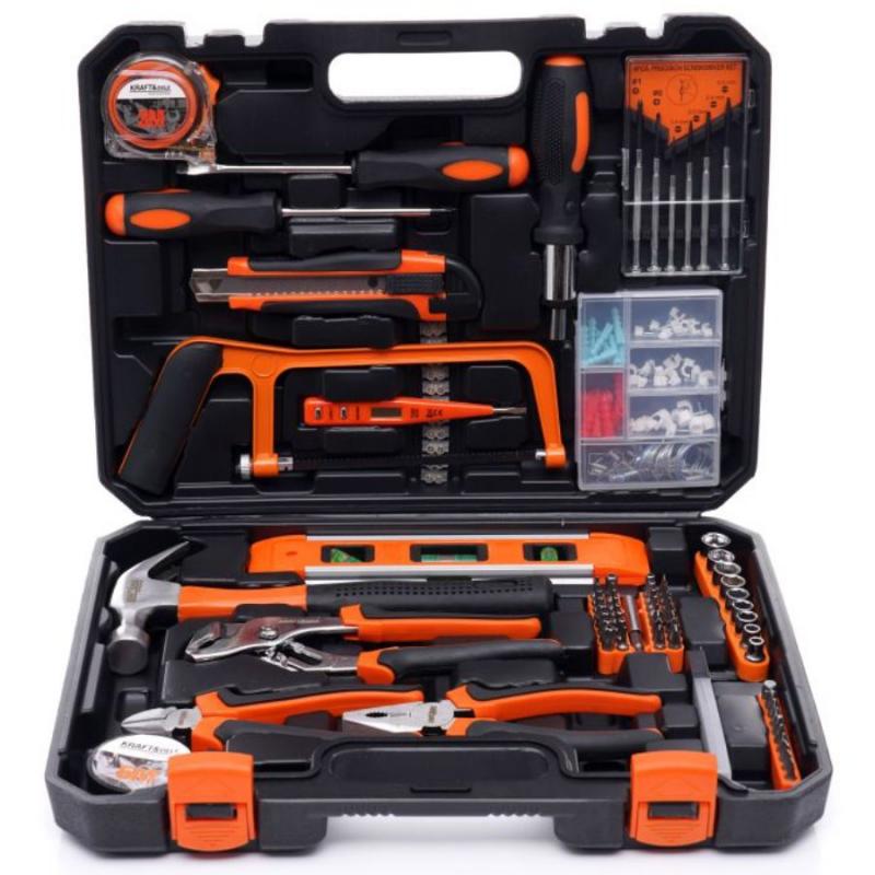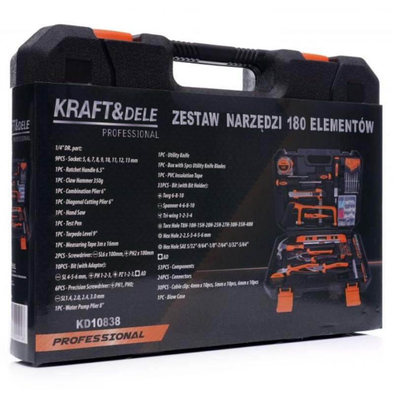 Īpaši plašs Kraft & Dele darbarīku komplekts. Darbarīki ir izgatavoti no rūdīta hroma vanādija (CrV) instrumentu tērauda. Hroms garantē tērauda izturību pret koroziju, oksidāciju, nodilumu un izturību pret augstām temperatūrām. Koferis izgatavots no izturīgas plastmasas, ļauj glabāt instrumentus sakārtotus un viegli pārnēsājamus. Katram instrumentam ir sava vieta.