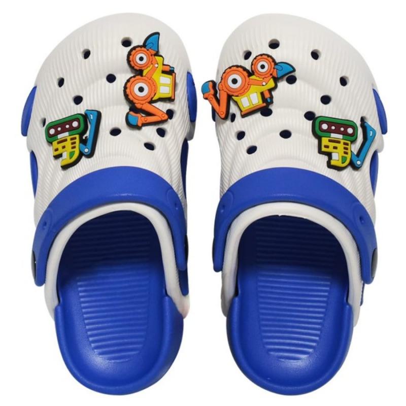 Baltas dārza čības ar zilu siksnu un zoli un krāsainiem dekoriem bērniem izgatavotas no EVA (etilēnvinilacetāta). EVA materiāla apavi ir lieliski piemēroti ikdienas darbiem un brīvā laika aktivitātēm. Tie ir īpaši viegli, mīksti, elastīgi, ērti, neslīdoši un viegli kopjami. Reljefā virsma iekšpusē pēdas zonā uzlabo asinsriti un ventilācijas atveres uz apavu virsmas nodrošina brīvu gaisa piekļuvi. Izmērs 18 - 19.