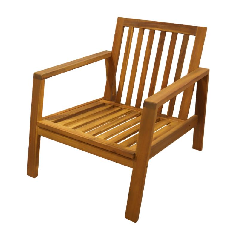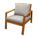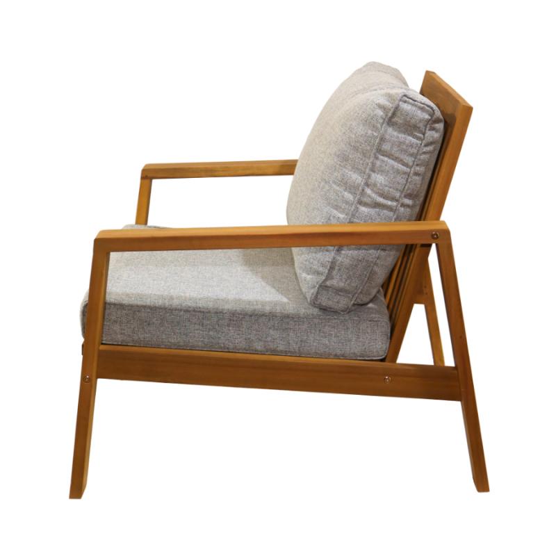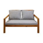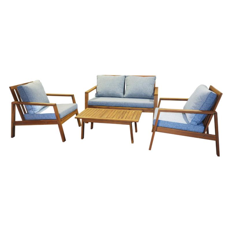Dārza mēbeļu komplektā ietilpst divvietīgs dīvāns, divi krēsli un zems galdiņš. Komplekts piemērots lietošanai terasē, uz balkona vai dārzā. Tā konstrukcija izgatavota no FSC sertificētas akācijas koksnes, kas ir noturīga pret mitrumu un piemērota izmantošanai ārpus telpām. Komplektā iekļautie sēdvietu un atzveltņu spilveni ir pildīti ar D17 blīvuma poliuretāna putām, pārklāti ar 180 g/m² poliestera audumu, kas nodrošina komfortu un ir viegli kopjams. Sēdvietu spilvenu biezums ir 10 cm, bet atzveltņu spilveni ir 12 cm biezi, nodrošinot ergonomisku atbalstu un ērtu sēdēšanu. Komplektam ir vienkāršs, bet funkcionāls dizains, kas iederas gan modernā, gan klasiskā vidē. Pateicoties kvalitatīvajiem materiāliem un stabilajai konstrukcijai, mēbeles ir piemērotas ilgstošai lietošanai dažādos laika apstākļos.