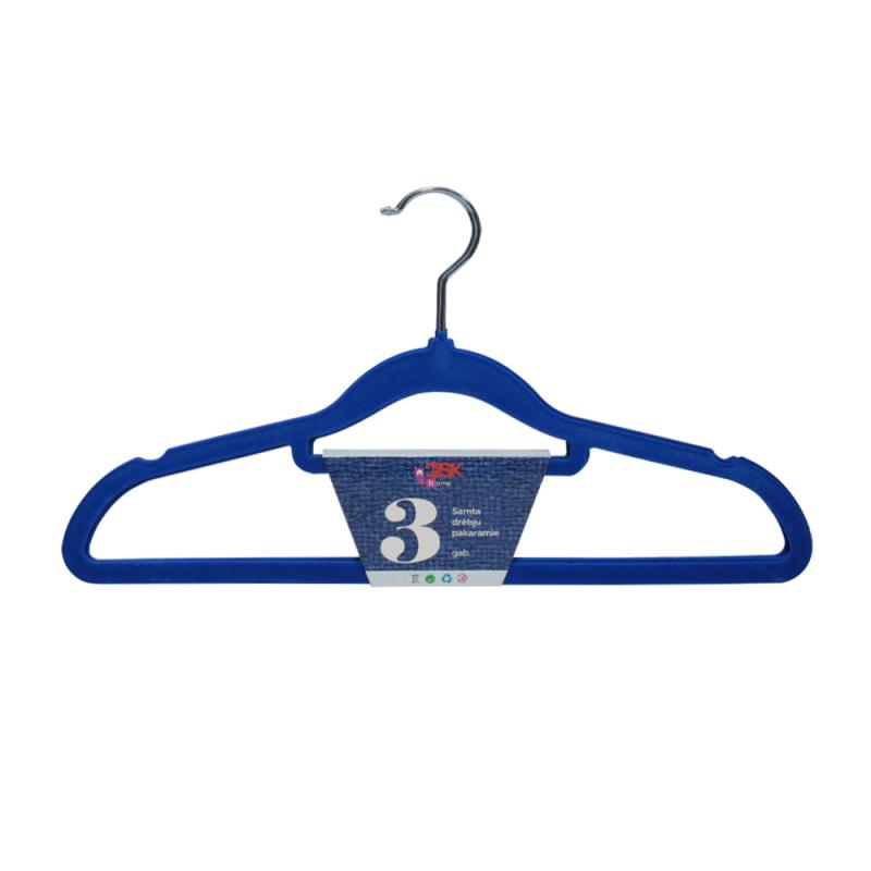 BESK samta drēbju pakaramie ir īpaši piemēroti apģērba drošai un saudzīgai uzglabāšanai garderobē. Pakaramie izgatavoti no izturīgas plastmasas ar patīkamu samta pārklājumu, kas palīdz aizsargāt audumu no skrāpējumiem un novērš apģērba noslīdēšanu. Katra pakaramā metāla āķis nodrošina ērtu lietošanu skapī. Komplektā ietilpst trīs zilas krāsas pakaramie, kas piemēroti dažādu apģērbu uzglabāšanai. Izmērs 42 x 23 cm.