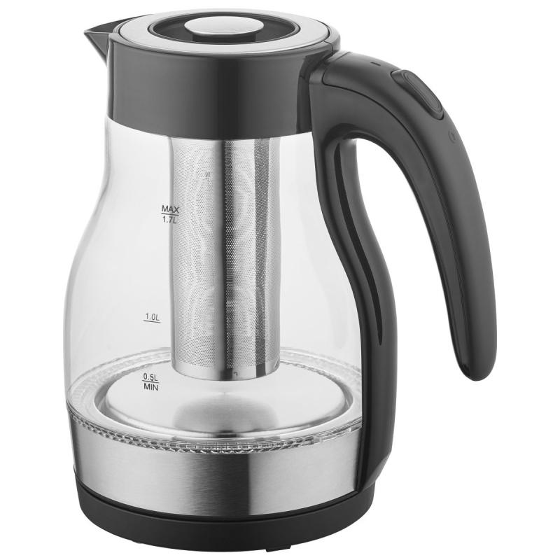 Elektriskā tējkanna ar 1.7 l ietilpību un 360° rotācijas pamatni ir ērta un praktiska ikdienas lietošanai. Tējkannas augstas kvalitātes borsilikāta stikla korpuss ir izturīgs un noturīgs pret traipiem, nodrošinot ilgstošu lietošanu. Slēptais nerūsējošā tērauda sildelements un aizsardzība pret vārīšanos bez ūdens, kā arī LED indikators un automātiskā izslēgšanās funkcija, kad ūdens ir uzvārījies, nodrošina lietotāja ērtības un drošību. Noņemamais vāks un komplektā iekļautais sietiņš padara šo tējkannu īpaši ērtu maltās kafijas un beramās tējas cienītājiem, kā arī atvieglo tās tīrīšanu. Vārot tikai ūdeni, sietiņu varat izņemt un pasargāt to no liekām kaļķakmens nogulsnēm. Jauda 1850 - 2200 W garantē ātru ūdens uzvārīšanu, padarot šo tējkannu par lielisku izvēli.
