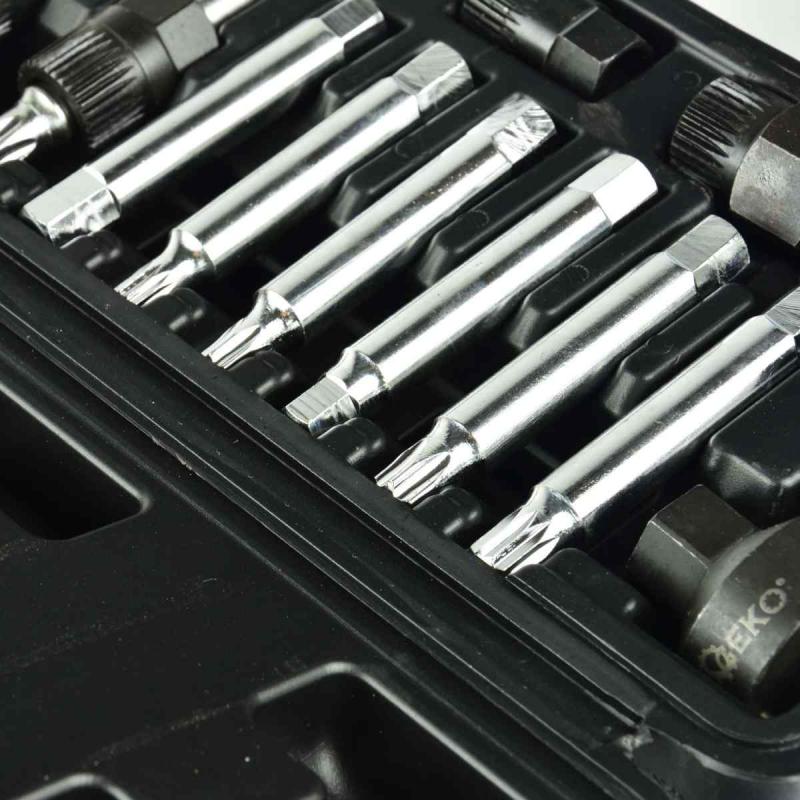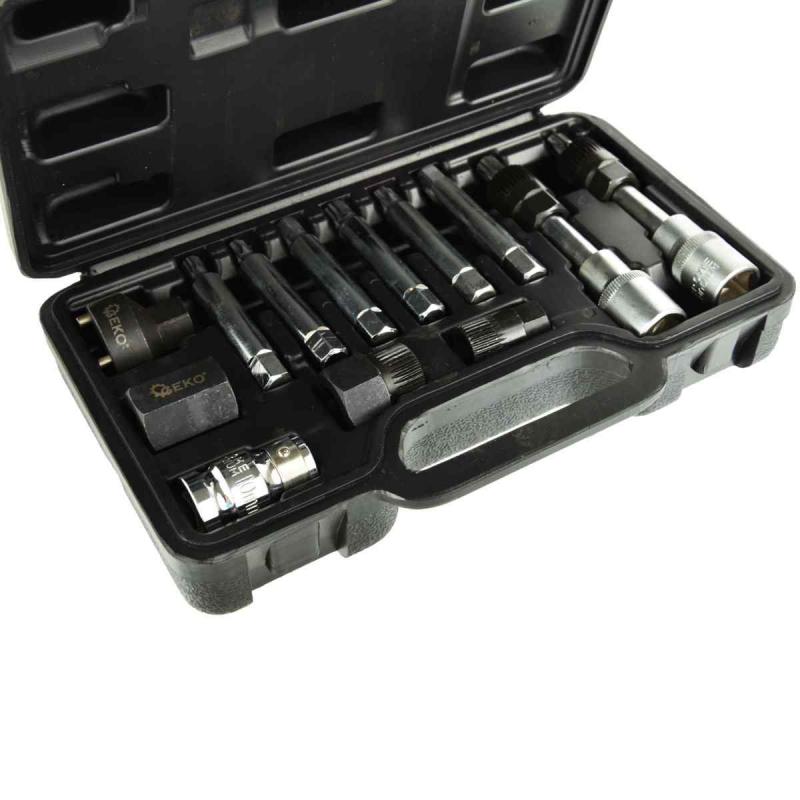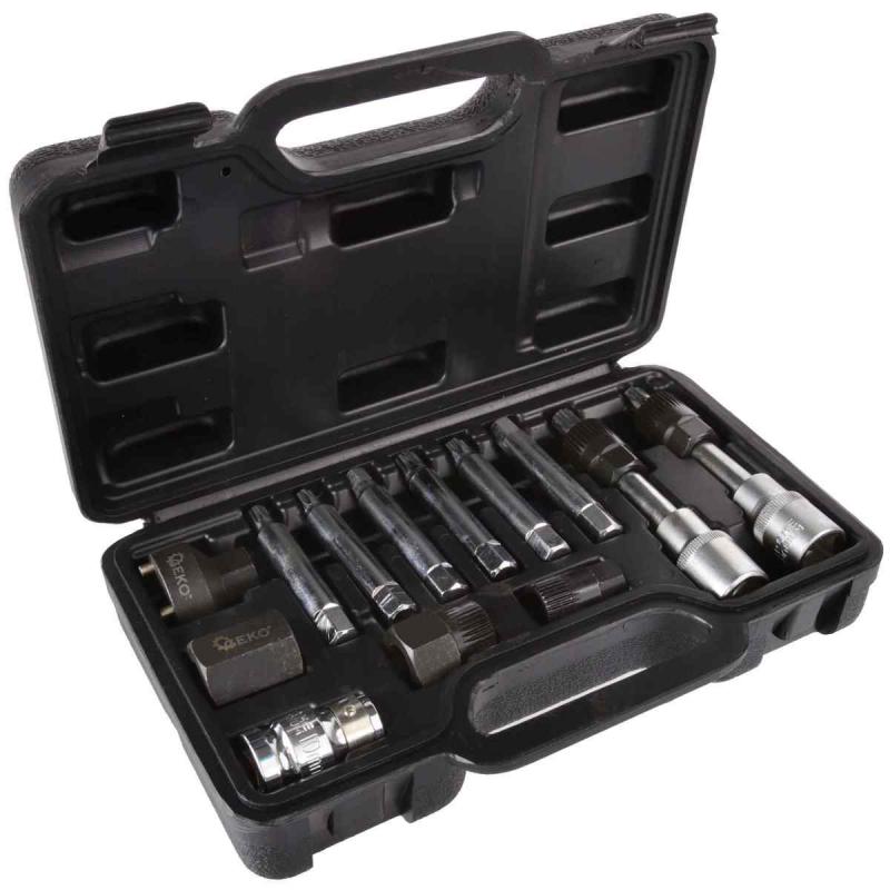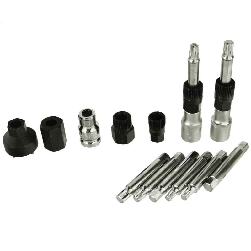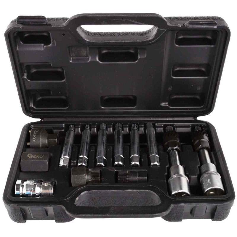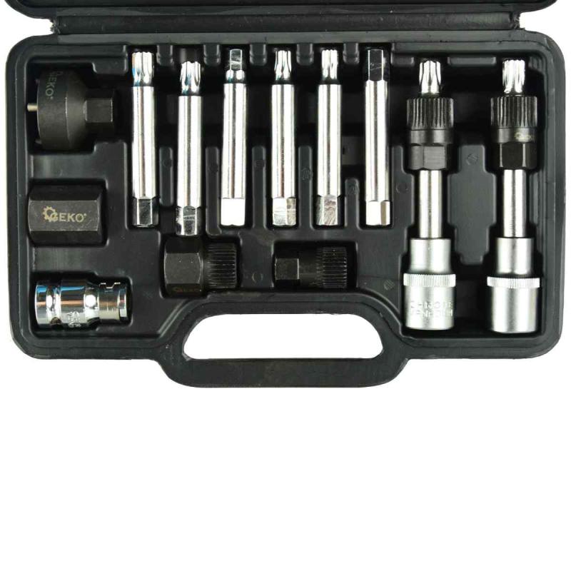 Uzgriežņu atslēgu komplekts ģeneratoru montāžai un demontāžai. Atslēgas ir izgatavotas no augstas kvalitātes CrV hroma-vanādija tērauda, kas padara tās izturīgas pret bojājumiem. Uzgriežņu atslēgas ļauj vienlaikus atskrūvēt skriemeļa stiprinājuma skrūvi (izmantojot atbilstošo uzgali) un noturēt skriemeli ar sajūgu (izmantojot specializētu ligzdu). Komplekts lieliski piemērots profesionālām darbnīcām un autoservisiem. Komplektā ir adapteri VW, Audi, Seat, BMW, Mercedes, Ford automašīnām