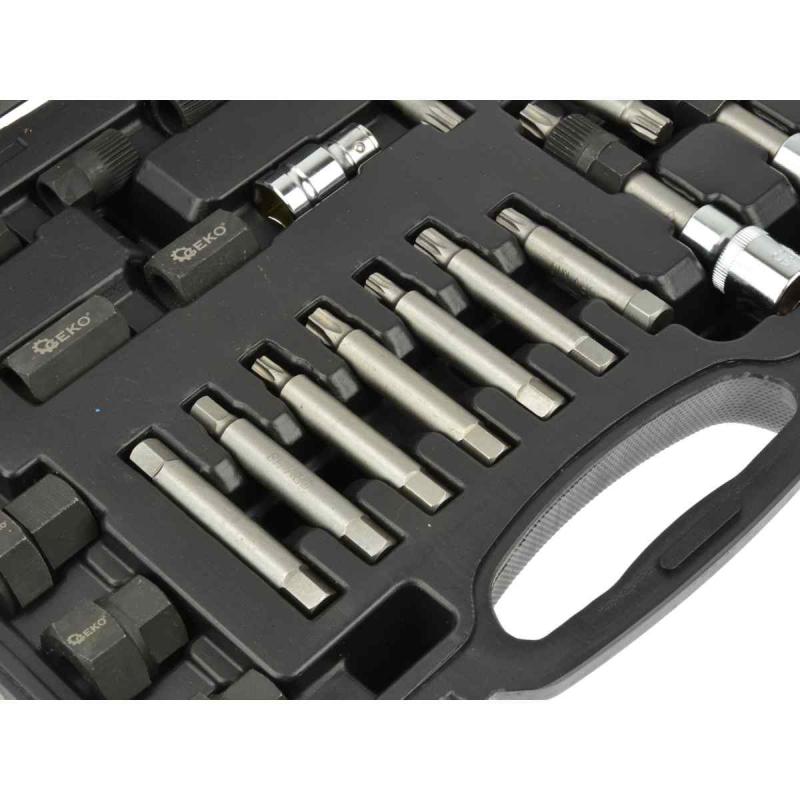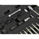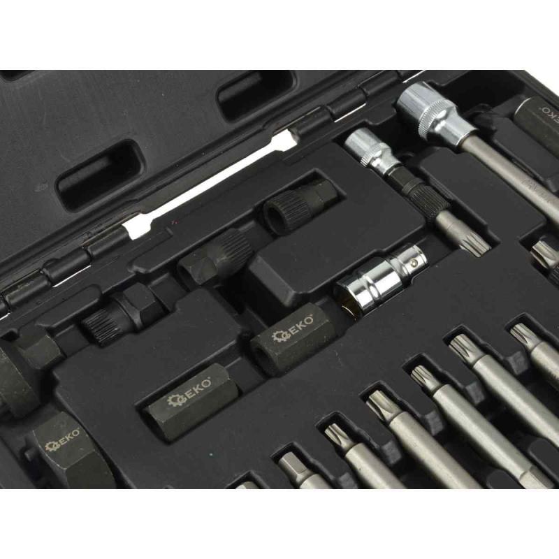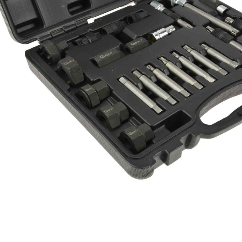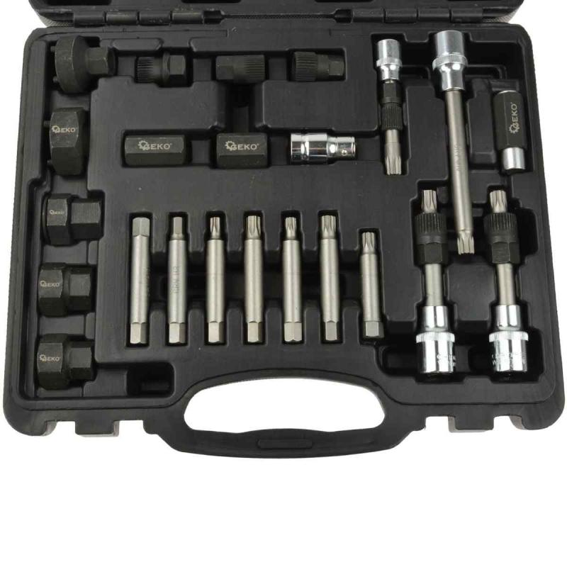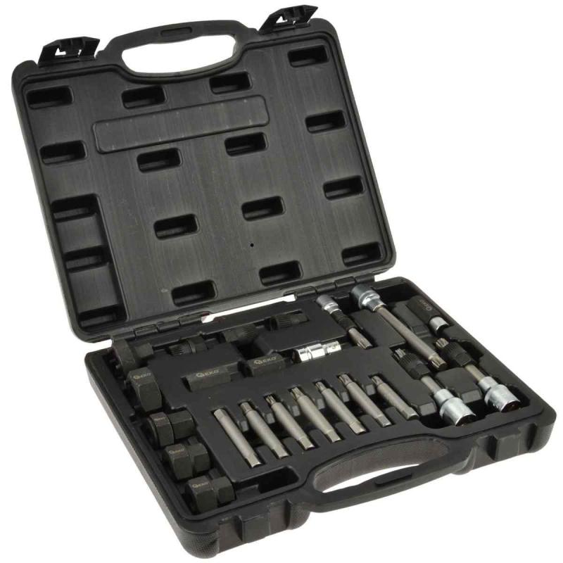 Uzgriežņu atslēgu komplekts ģeneratoru montāžai un demontāžai. Atslēgas ir izgatavotas no augstas kvalitātes CrV hroma-vanādija tērauda, kas padara tās izturīgas pret bojājumiem. Uzgriežņu atslēgas ļauj vienlaikus atskrūvēt skriemeļa stiprinājuma skrūvi (izmantojot atbilstošo uzgali) un noturēt skriemeli ar sajūgu (izmantojot specializētu ligzdu). Komplekts lieliski piemērots profesionālām darbnīcām un autoservisiem. Komplektā ir adapteri Mercedes, BMW, Ford, VAG, Fiat, Renault, Porsche, Vauxhall, Toyota u.c.