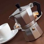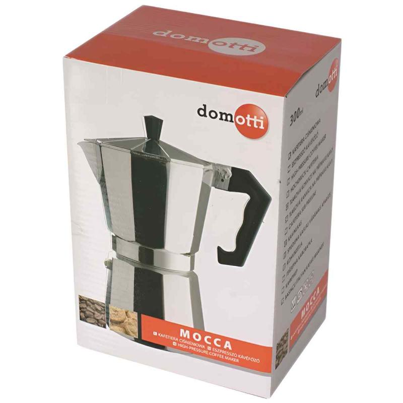 Domotti Mocca alumīnija kafijas kanna ir klasisks risinājums intensīvai un aromātiskai espresso pagatavošanai uz plīts. Tās konstrukcija sastāv no trīs daļām – apakšējās ūdens tvertnes, centrālā filtra maltai kafijai un augšējā trauka pagatavotajam dzērienam. Karstumam palielinoties, radītais spiediens virza ūdeni caur kafijas slāni uz augšu, nodrošinot bagātīgu garšu. Kanniņa piemērota gāzes, elektriskajām, halogēna un keramiskajām plītīm. Tilpums 150 ml (līdz 3 tasītēm), diametrs 10 cm, augstums 17 cm, platums ar rokturi 12 cm, pamatnes diametrs 8 cm.