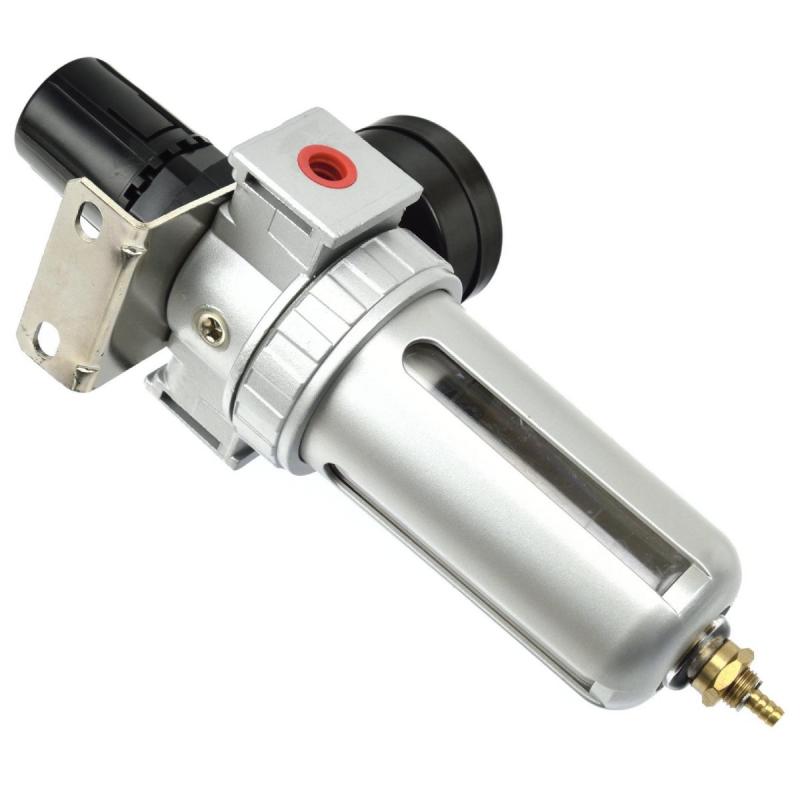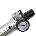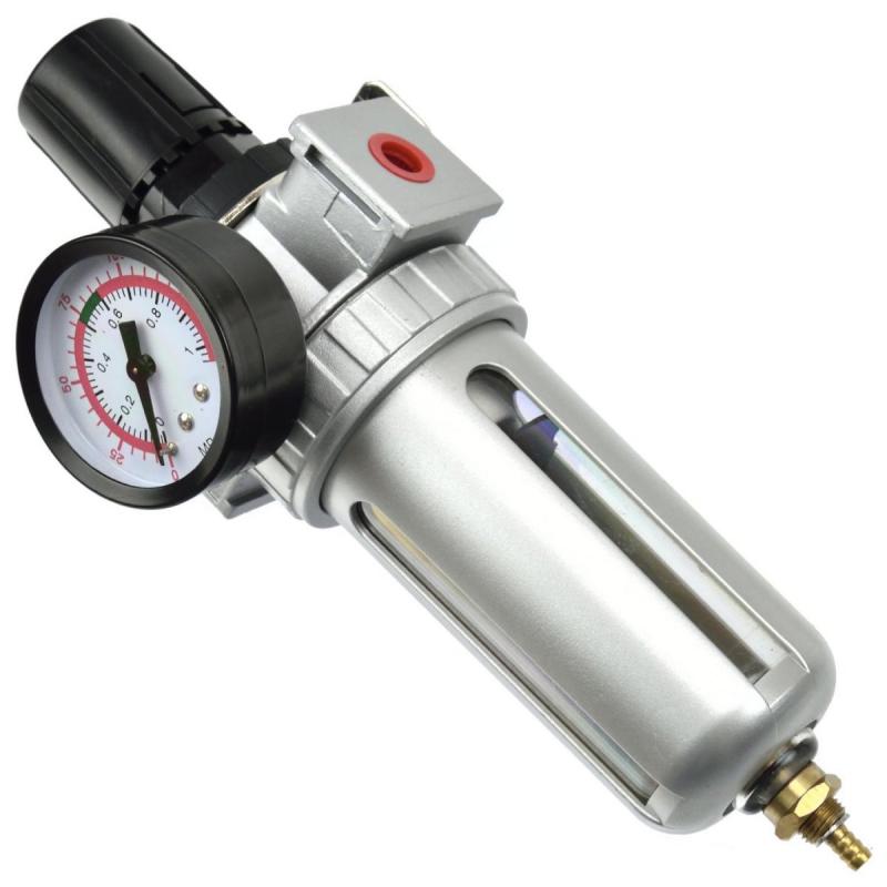 Reduktors ar gaisa filtru un eļļošanu. Reduktors ar manometru nodrošina precīzu darba gaisa spiediena regulēšanu līdz 10 bar. To izmanto, lai uzturētu pastāvīgu darba spiedienu, kas nepieciešams, lai pareizi darbotos krāsas pistoles, triecienuzgriežņu atslēgas, slīpmašīnas utt. Gaisa filtrs noņem mitrumu, filtrē daļiņas un ar saspiestu gaisu saistīto kondensāciju. Spēcīgs eļļotājs ieeļļo instrumentus darbības laikā. Tas viss nodrošina pneimatisko instrumentu tīrību un sausumu, palielinot to kalpošanas laiku.