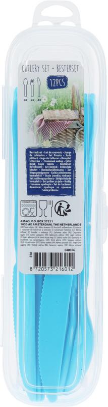 Galda piederumu komplektā ir 12 plastmasas galda piederumi kompaktā iepakojumā. Ērtos plastmasas galda piederumus četriem ir ērti paņemt līdzi piknikā, izbraucienā, kajītē vai ceļojumā. Krāsainie galda piederumi ir piemēroti arī bērniem. Plastmasas galda piederumus var mazgāt trauku mazgājamajā mašīnā, tāpēc karotes, dakšiņas un naži kalpo ilgi. Komplektā ir 4 dakšiņas, 4 karotes un 4 naži. Galda piederumu garums ir aptuveni 25 cm.
