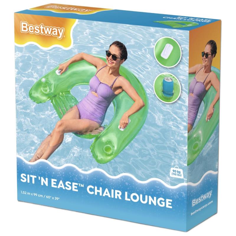 Bestway® Sit 'N Ease™ piepūšamais krēsls ir ideāls veids, kā izbaudīt atpūtu ūdenī. Ar izmēriem 152 x 99 cm, šis krēsls ir piemērots vienai personai līdz 90 kg. Divi izturīgi rokturi nodrošina papildu stabilitāti, kamēr divi dzērienu turētāji ļauj ērti novietot dzērienus. Divas gaisa kameras sniedz optimālu komfortu un pietiekamu pacelšanas spēju, lai varētu pilnībā atpūsties un izbaudīt ūdens prieku. Šis krēsls ir izgatavots no izturīga PVC materiāla un komplektā iekļauts arī remonta ielāps.