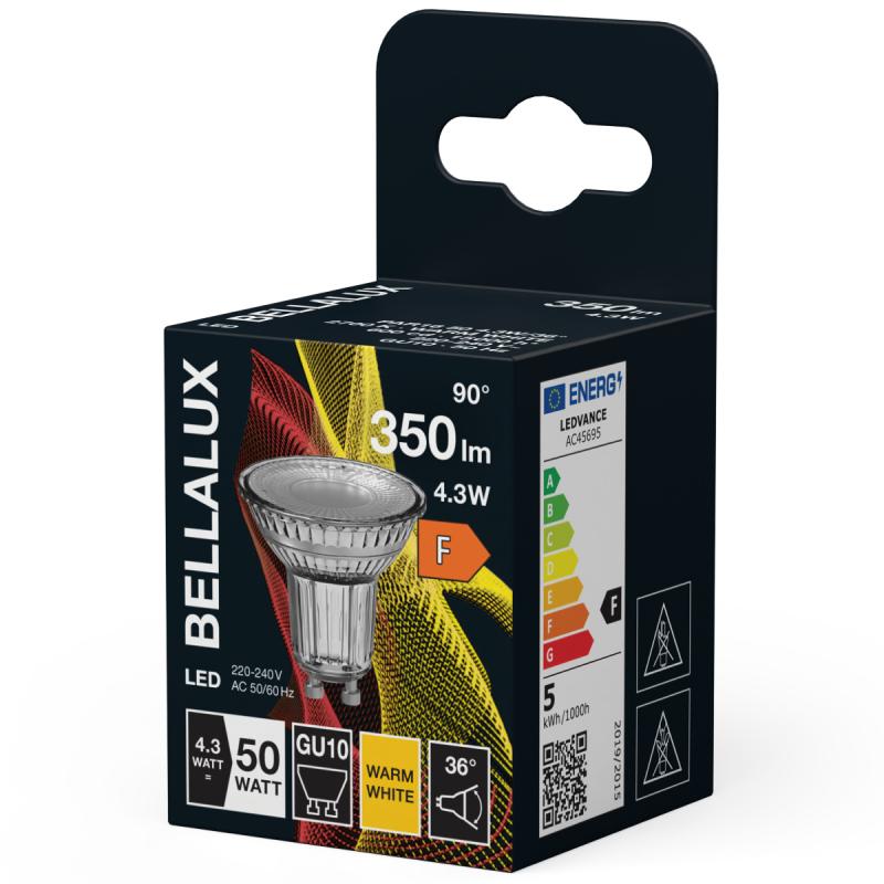 Bellalux MR16 prožektora formas LED spuldze ar GU10 ligzdu izstaro silti baltu gaismu, kas piemērota akcenta apgaismojumam, griestu prožektoriem un vitrīnām. Tās gaismas plūsma ir 350 lūmeni un enerģijas patēriņš ir 4.3 W. Tā sniedz spilgtumu, kas atbilst 50 W kvēlspuldzei. Dzidrais pārklājums izceļ LED dizainu un nodrošina tiešu gaismas staru. Spuldzes izmērs (D x A) 50 x 54 mm.