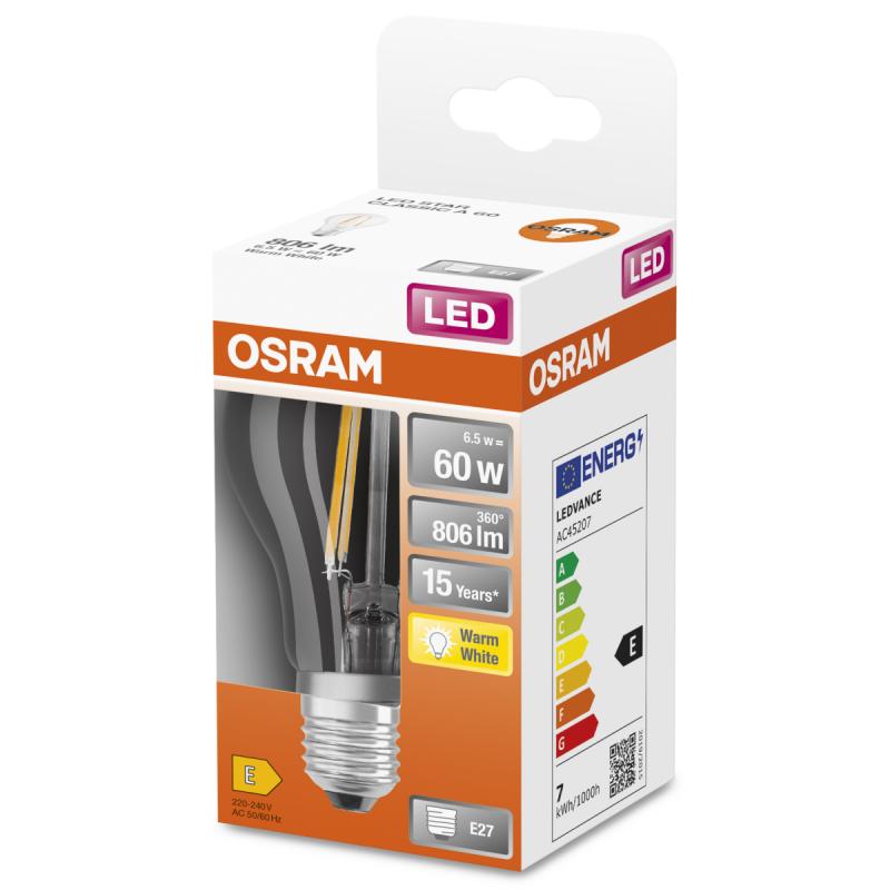 Osram A60 bumbierveida formas LED spuldze ar E27 ligzdu izstaro silti baltu gaismu, kas piemērota ikdienas apgaismojumam dzīvojamās telpās. Tās gaismas plūsma ir 806 lūmeni un enerģijas patēriņš ir 6.5 W. Tā sniedz spilgtumu, kas atbilst 60 W kvēlspuldzei. Dzidrais pārklājums izceļ LED dizainu un nodrošina tiešu gaismas staru. Spuldzes izmērs (D x A) 60 x 105 mm.