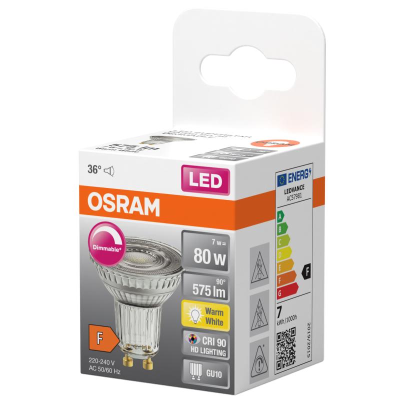 Osram MR16 prožektora formas LED spuldze ar GU10 ligzdu izstaro silti baltu gaismu, kas piemērota akcenta apgaismojumam, griestu prožektoriem un vitrīnām. Tās gaismas plūsma ir 575 lūmeni un enerģijas patēriņš ir 8.3 W. Tā sniedz spilgtumu, kas atbilst 80 W kvēlspuldzei. Spuldze ir dimmējama, tāpēc iespējams pielāgot gaismas intensitāti atbilstoši noskaņai. Dzidrais pārklājums izceļ LED dizainu un nodrošina tiešu gaismas staru. Spuldzes izmērs (D x A) 50 x 52 mm.